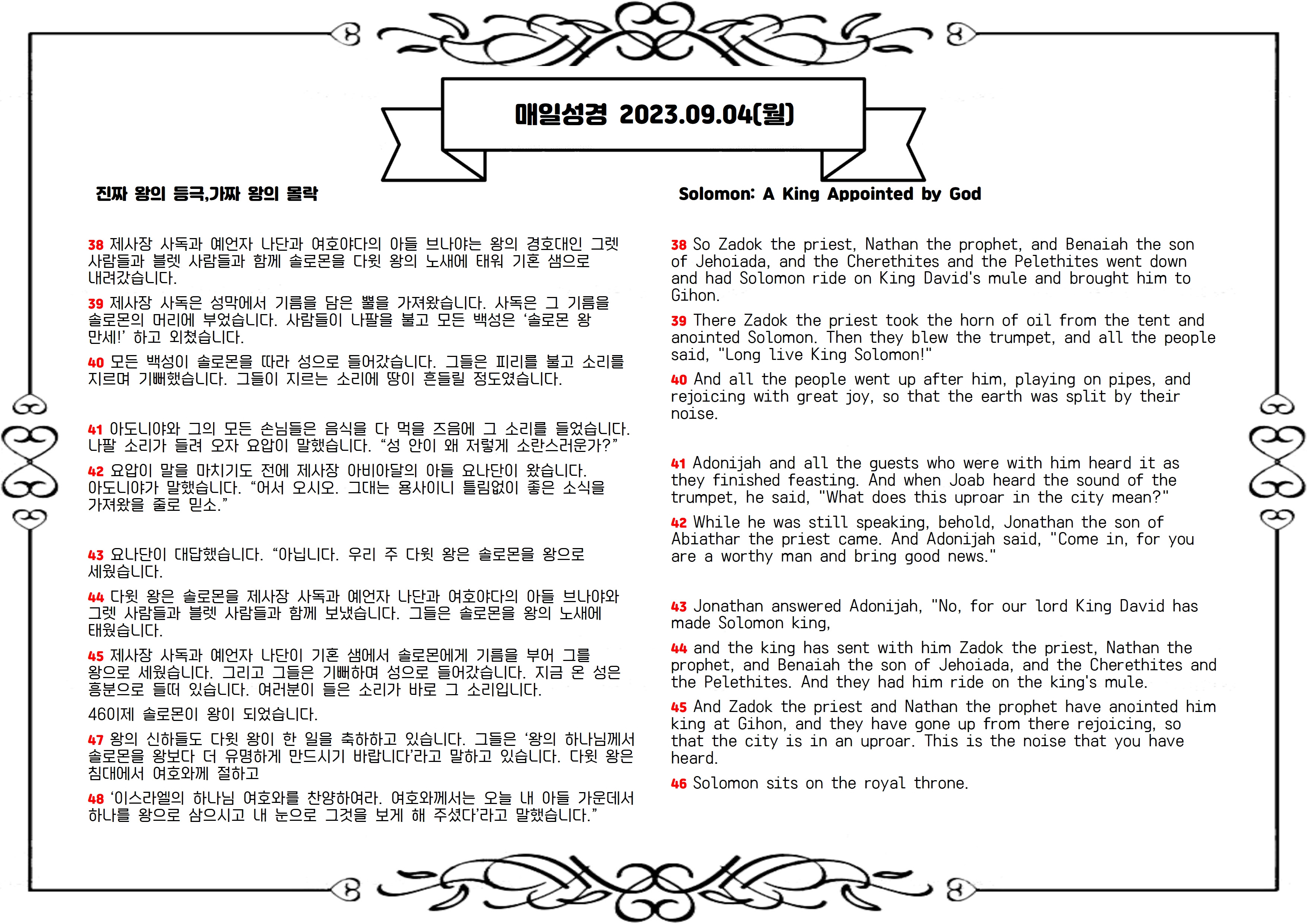 다윗의 명령대로 사독과 나단과 브나야가 솔로몬을 왕의 노새에 태워 기혼으로 데리고 갑니다. 다윗 왕의 호위병인 그렛 사람과 블렛 사람이 그들을 호위했습니다(38절). 사독이 솔로몬에게 기름을 붓고 뿔나팔을 불고, 모든 백성이 ‘솔로몬 왕 만세’를 외칩니다. 그들은 피리를 불고 함성을 지르며 기뻐했는데, 이 소리가 너무 커서 엔 로겔에 있던 아도니야 무리도 들을 수 있었습니다(39-41절).