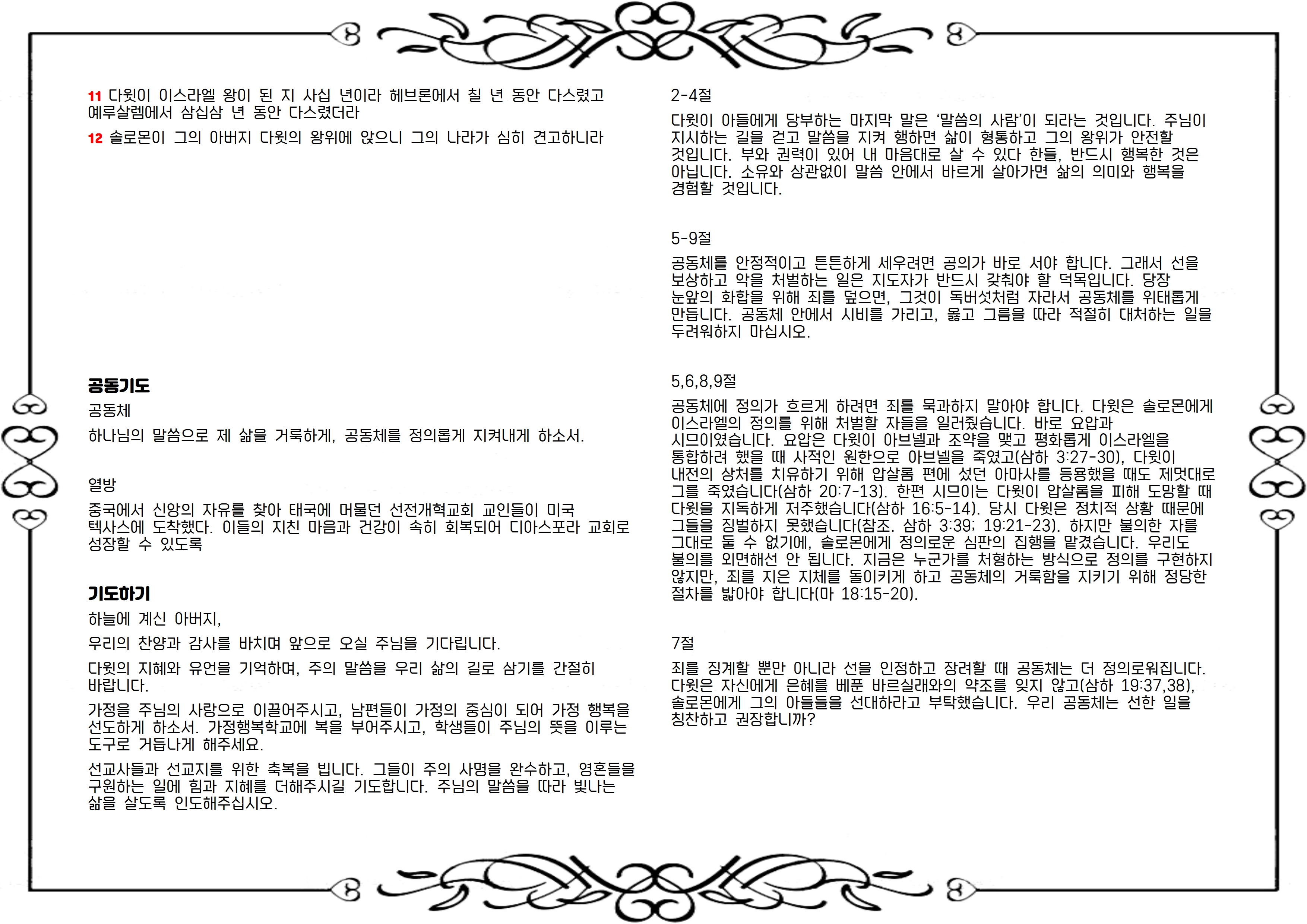 다윗의 지혜와 유언을 기억하며, 주의 말씀을 우리 삶의 길로 삼기를 간절히 바랍니다.