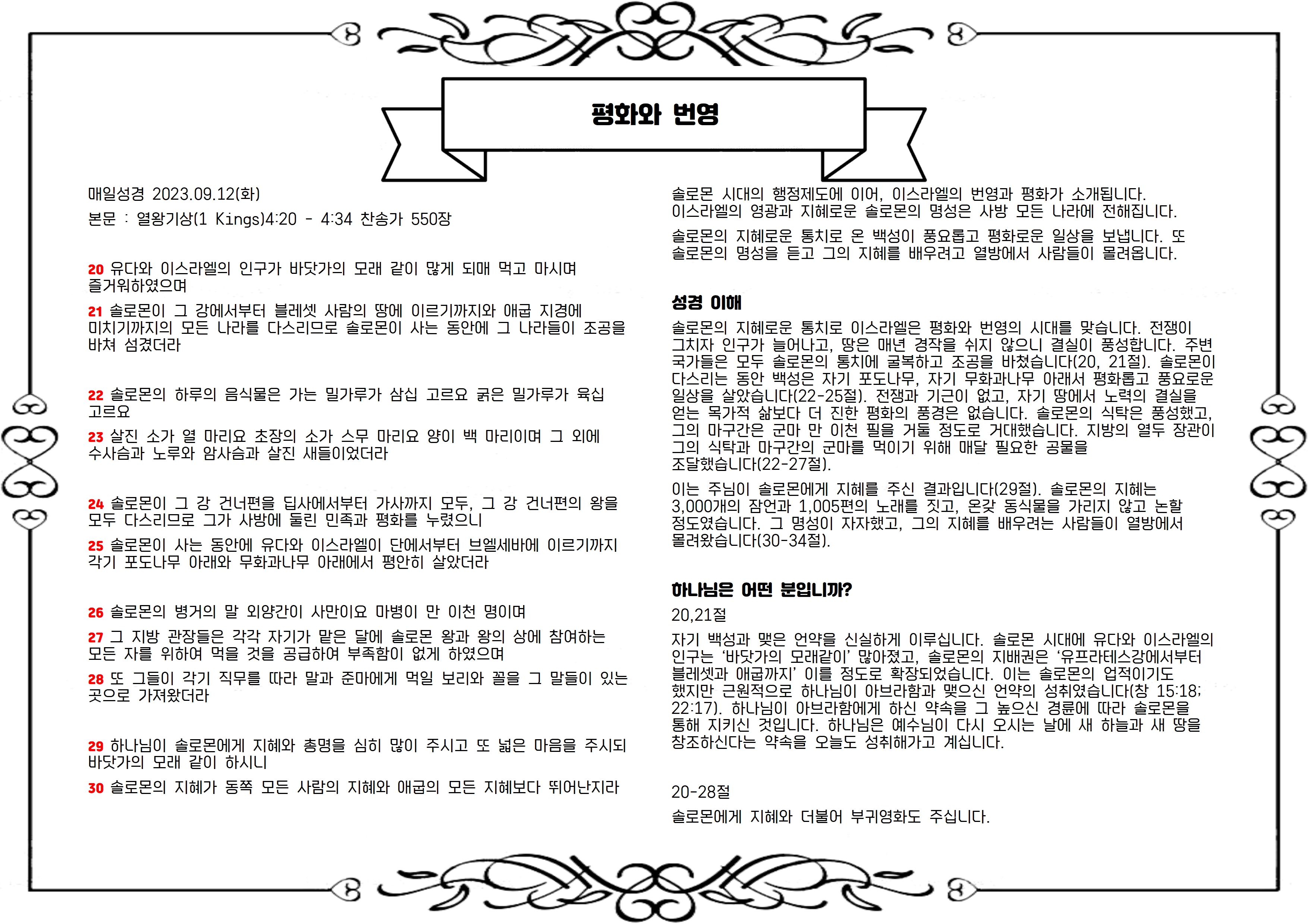 본문 : 열왕기상(1 Kings)4:20 - 4:34 찬송가 550장