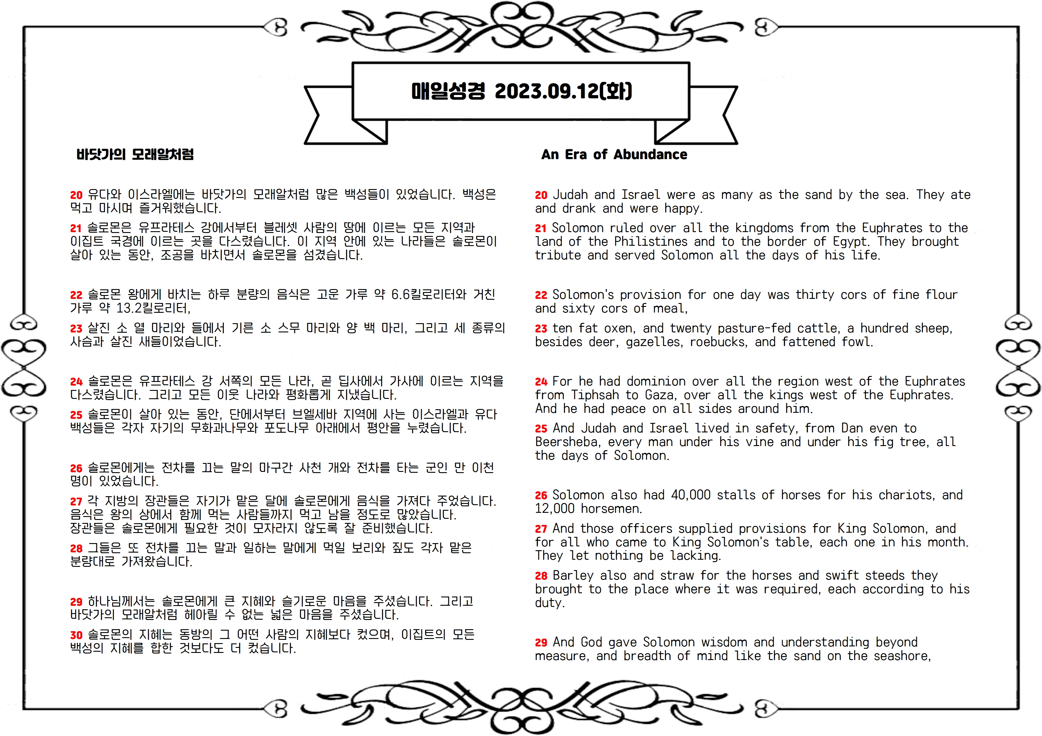 솔로몬 시대의 행정제도에 이어, 이스라엘의 번영과 평화가 소개됩니다. 이스라엘의 영광과 지혜로운 솔로몬의 명성은 사방 모든 나라에 전해집니다.