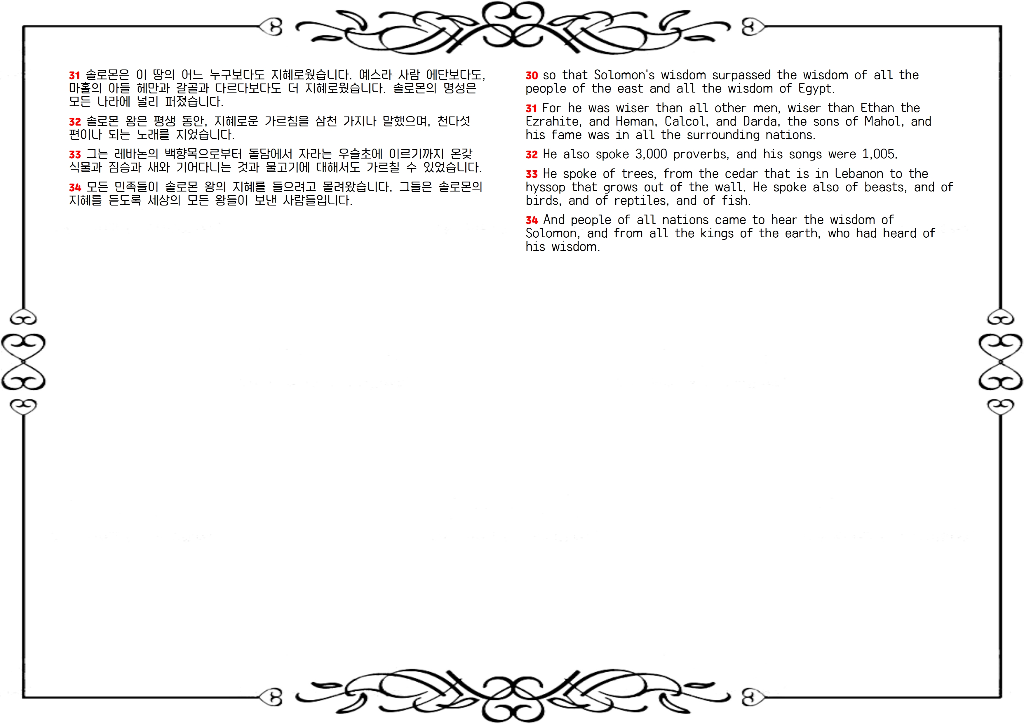 이는 주님이 솔로몬에게 지혜를 주신 결과입니다(29절). 솔로몬의 지혜는 3,000개의 잠언과 1,005편의 노래를 짓고, 온갖 동식물을 가리지 않고 논할 정도였습니다. 그 명성이 자자했고, 그의 지혜를 배우려는 사람들이 열방에서 몰려왔습니다(30-34절).