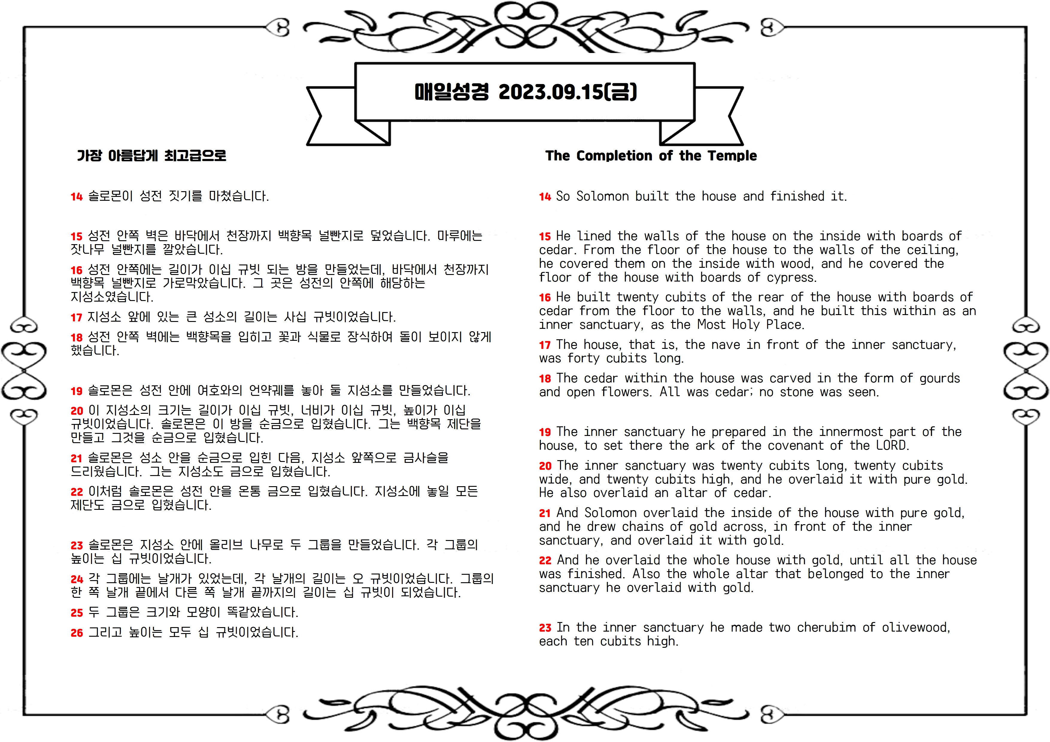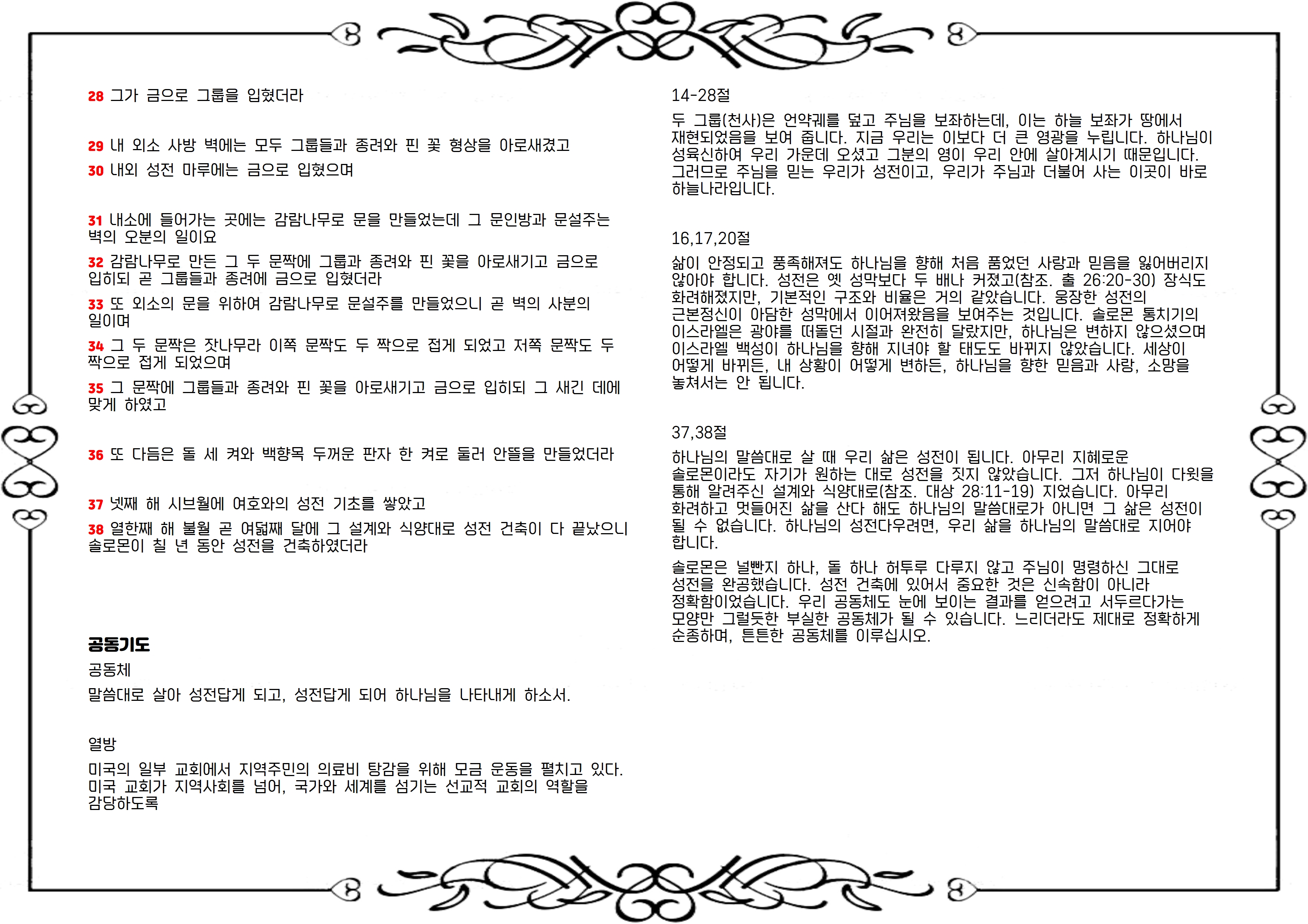 성전 내부의 벽과 천장은 백향목으로, 바닥은 잣나무로 두르고 그 위에 순금을 입혀 마감합니다(15-18절). 성소의 안쪽 벽과 문에는 그룹의 형상과 종려나무, 활짝 핀 꽃 모양의 무늬를 새겨 넣었습니다(31-35절). 성전 앞에는 안뜰을 만들었고, 다듬은 돌과 백향목으로 벽을 쳤습니다(36절). 성전 건축은 솔로몬 통치 4년 2월에 시작해서, 11년 8월에 마무리됩니다(38절).