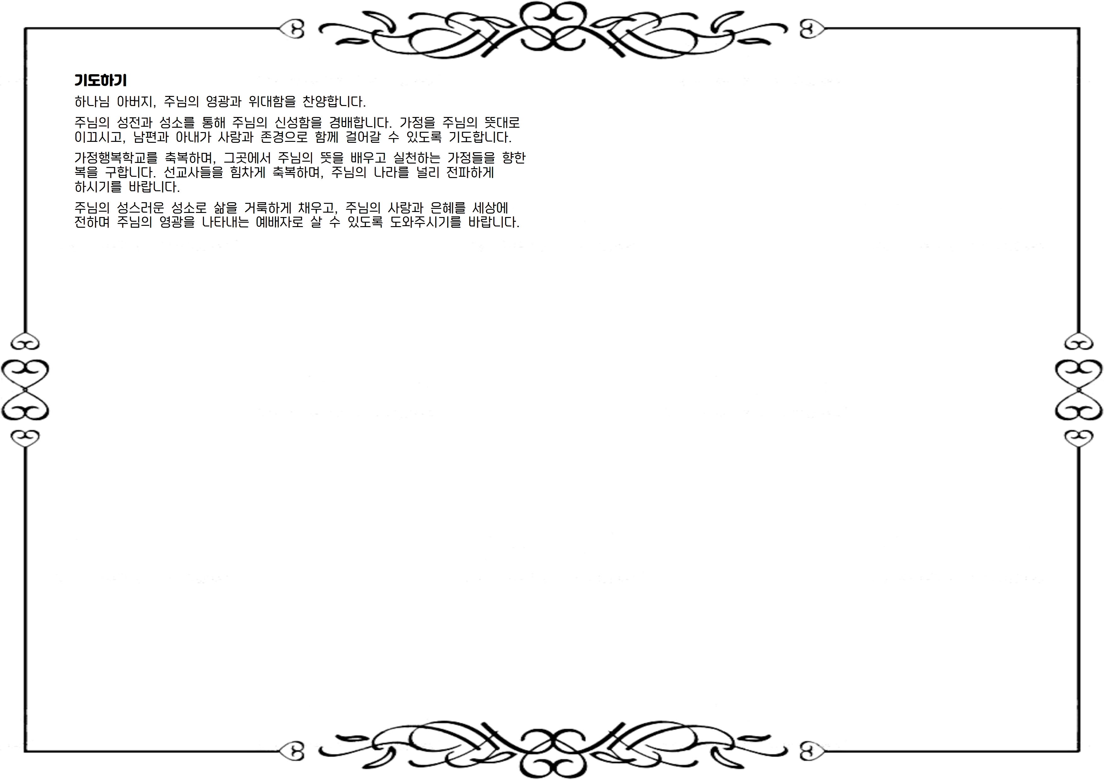 주님의 성전과 성소를 통해 주님의 신성함을 경배합니다. 가정을 주님의 뜻대로 이끄시고, 남편과 아내가 사랑과 존경으로 함께 걸어갈 수 있도록 기도합니다.