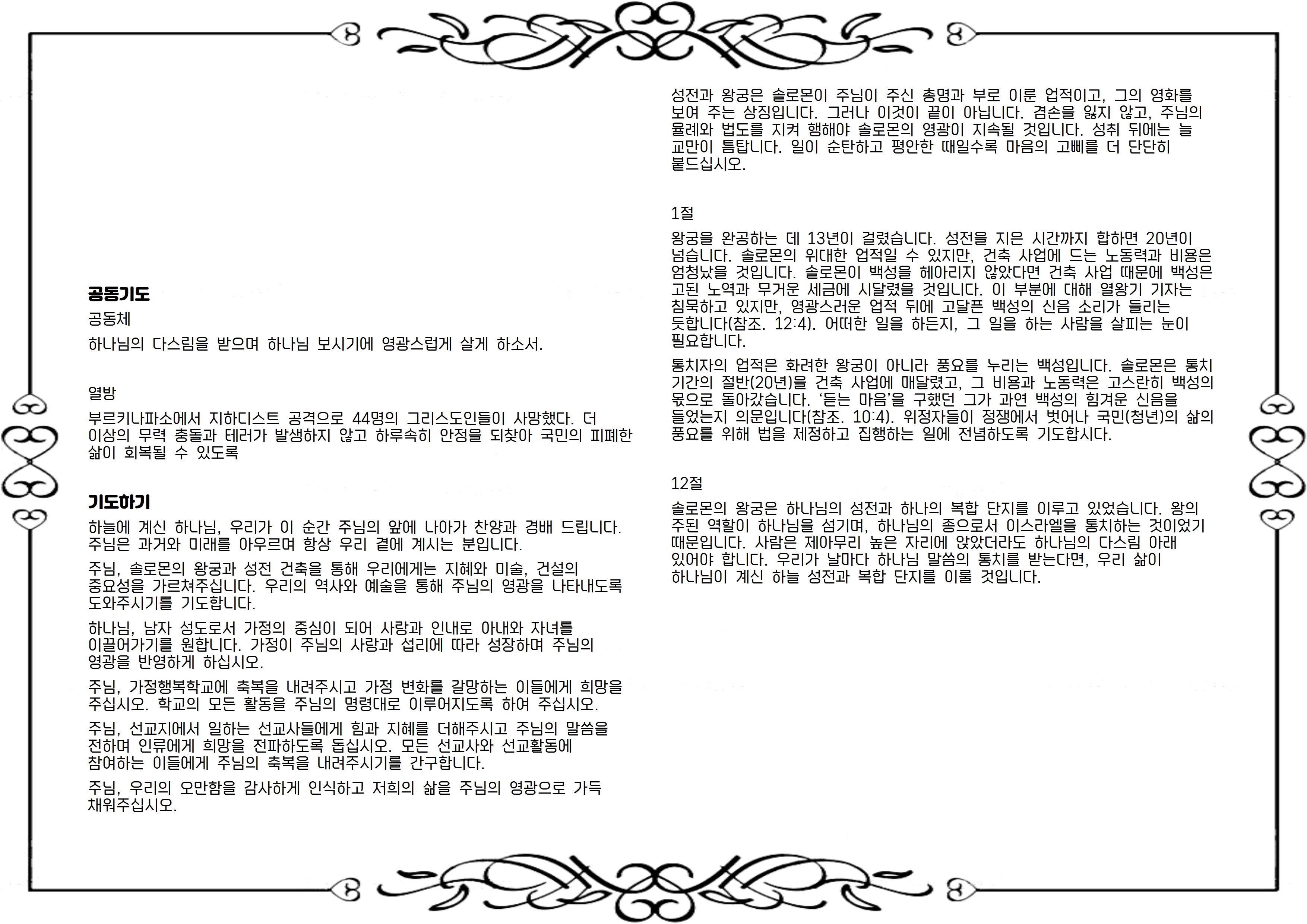 주님, 솔로몬의 왕궁과 성전 건축을 통해 우리에게는 지혜와 미술, 건설의 중요성을 가르쳐주십니다. 우리의 역사와 예술을 통해 주님의 영광을 나타내도록 도와주시기를 기도합니다.