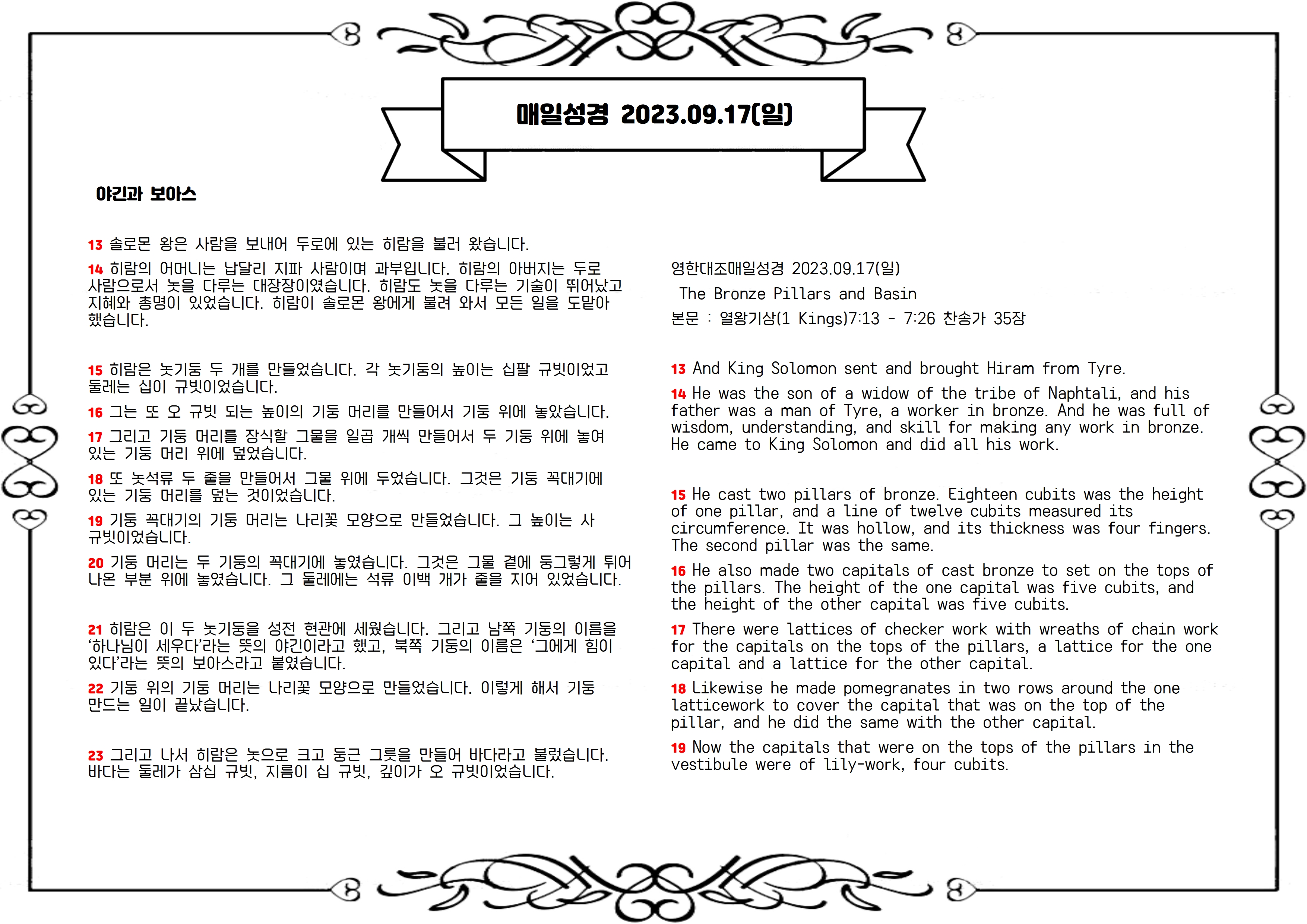 후람은 높이 약 8미터, 둘레 5.4미터의 놋쇠 기둥 두 개를 만들고, 그 기둥 꼭대기에 2.25미터의 기둥머리를 얹고 장식을 올렸습니다(15-18절). 이 두 놋쇠 기둥은 성전 현관 양편에 세우고, 오른쪽 기둥을 야긴, 왼쪽 기둥은 보아스라 불렀습니다(21절). 또 후람이 성전 뜰에 둘 놋쇠 물통을 만듭니다. 높이 2.25미터, 둘레 13.5미터 규모로 수천 리터의 물을 담을 수 있는 크기인데, 놋쇠 물통 아래 받침에는 열두 마리 놋 황소를 만들어 세 마리씩 동서남북으로 향하게 했습니다(22-25절).