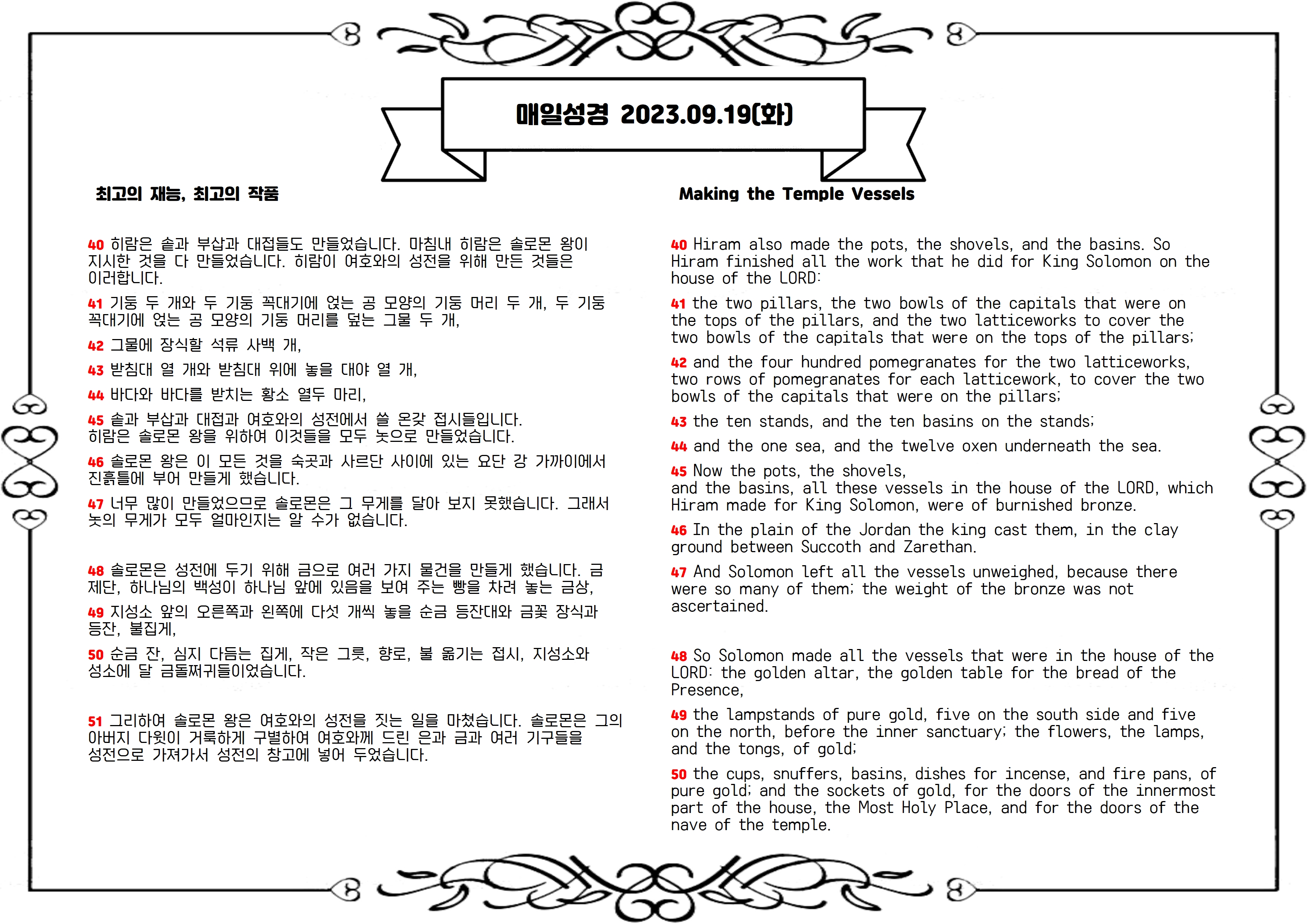 놋쇠 대장장이 후람이 성전에 필요한 나머지 기구들, 즉 솥, 부삽, 피 뿌리는 대접을 제작합니다. 이로써 그가 솔로몬 왕이 시킨 모든 일을 마무리합니다(40절). 후람이 성전을 위해 만든 것은 성전 현관 앞에 세운 두 놋쇠 기둥, 그 기둥 꼭대기에 얹은 기둥머리 둘, 기둥머리에 씌운 그물 두 개, 그물에 두 줄로 장식한 석류 사백 개, 놋쇠 받침대 열 개, 놋쇠 대야 열 개, 놋쇠 물통, 놋쇠 물통을 받치는 열 개의 황소 모양, 솥, 부삽, 피 뿌리는 대접입니다(41-45절). 이 놋 기구들은 요단 계곡의 진흙에 놋쇠 물을 부어 만들었는데, 그 수가 너무 많아 무게를 잴 수 없을 정도였습니다(46, 47절).