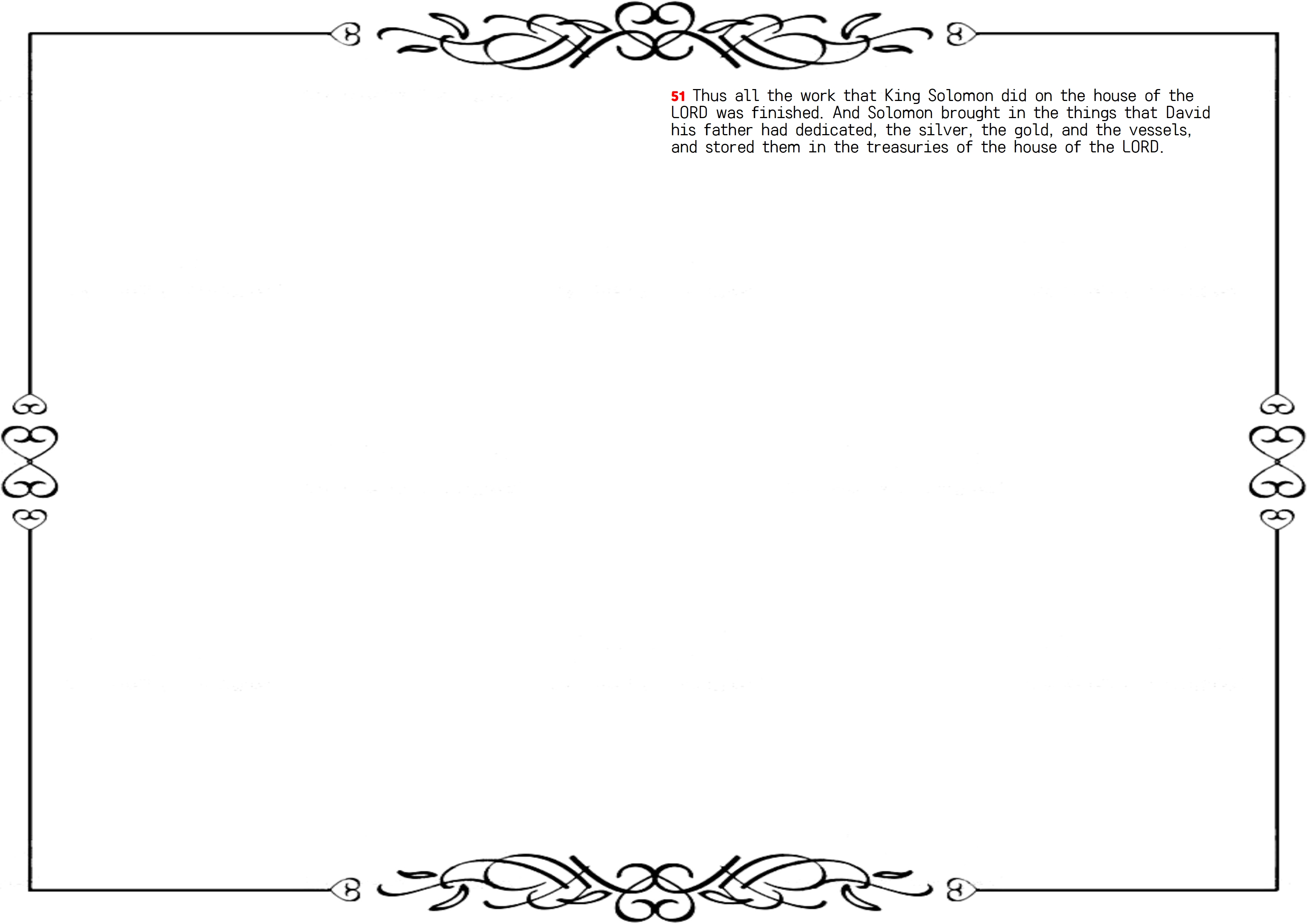51 Thus all the work that King Solomon did on the house of the LORD was finished. And Solomon brought in the things that David his father had dedicated, the silver, the gold, and the vessels, and stored them in the treasuries of the house of the LORD.