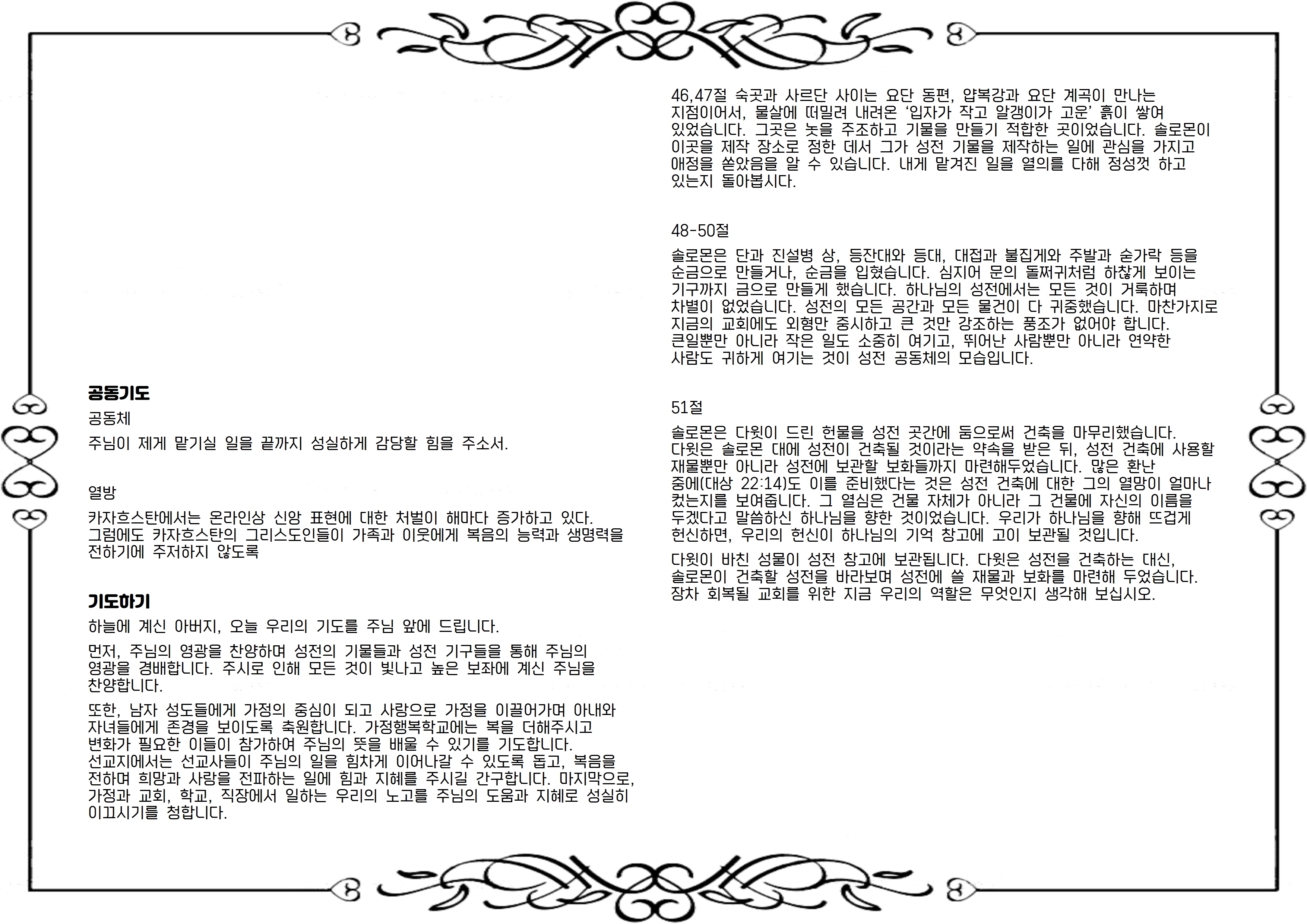 46,47절 숙곳과 사르단 사이는 요단 동편, 얍복강과 요단 계곡이 만나는 지점이어서, 물살에 떠밀려 내려온 ‘입자가 작고 알갱이가 고운’ 흙이 쌓여 있었습니다. 그곳은 놋을 주조하고 기물을 만들기 적합한 곳이었습니다. 솔로몬이 이곳을 제작 장소로 정한 데서 그가 성전 기물을 제작하는 일에 관심을 가지고 애정을 쏟았음을 알 수 있습니다. 내게 맡겨진 일을 열의를 다해 정성껏 하고 있는지 돌아봅시다.