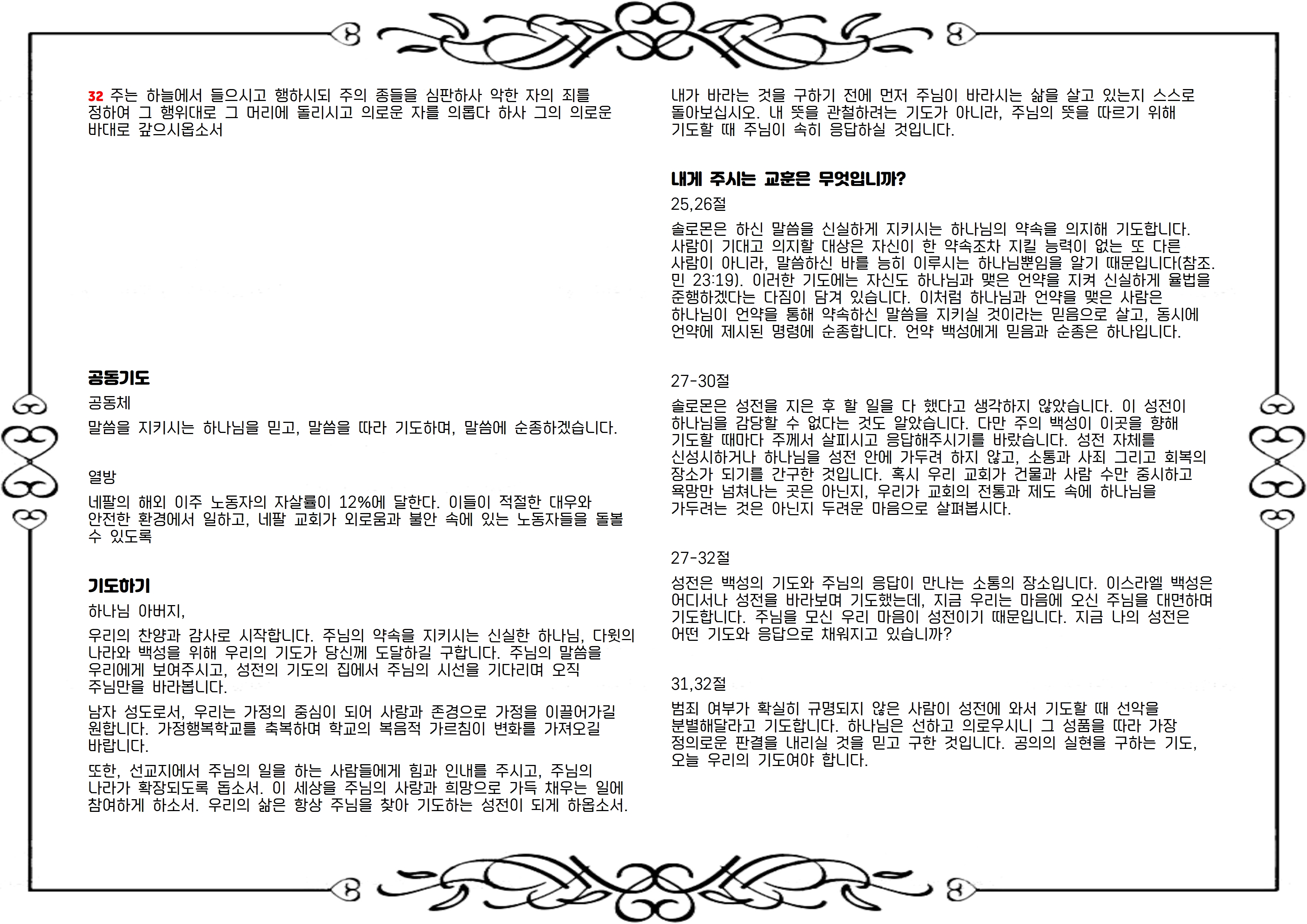또한, 선교지에서 주님의 일을 하는 사람들에게 힘과 인내를 주시고, 주님의 나라가 확장되도록 돕소서. 이 세상을 주님의 사랑과 희망으로 가득 채우는 일에 참여하게 하소서. 우리의 삶은 항상 주님을 찾아 기도하는 성전이 되게 하옵소서.