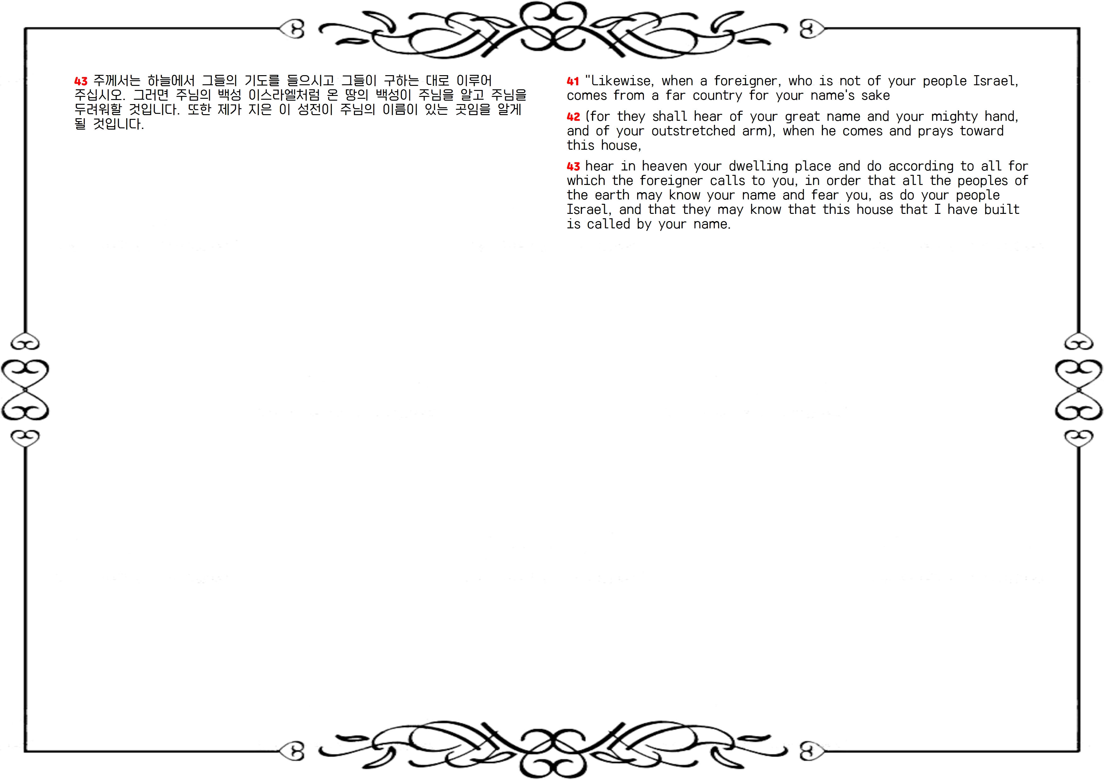 43 주는 계신 곳 하늘에서 들으시고 이방인이 주께 부르짖는 대로 이루사 땅의 만민이 주의 이름을 알고 주의 백성 이스라엘처럼 경외하게 하시오며 또 내가 건축한 이 성전을 주의 이름으로 일컫는 줄을 알게 하옵소서