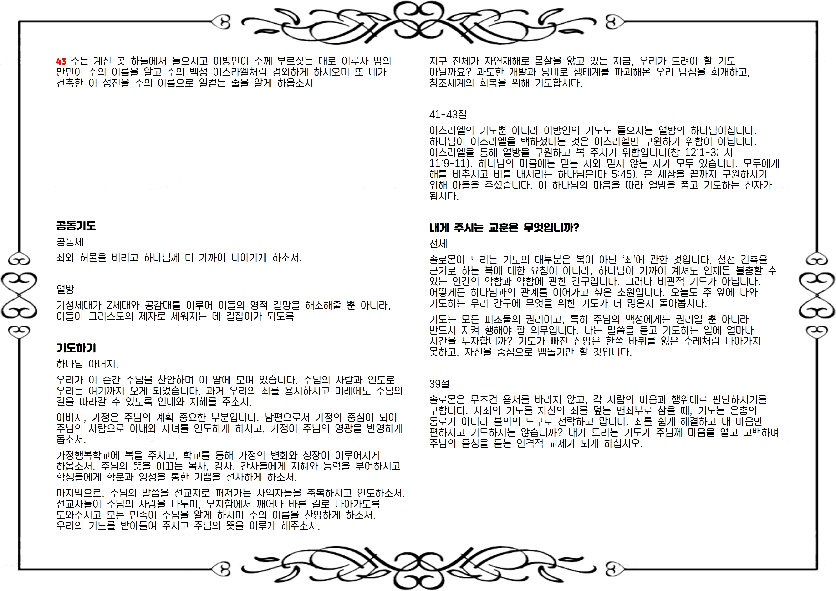 솔로몬은 국가적 재앙이 닥칠 때, 주의 백성이 죄를 뉘우치고 돌이키면 용서해 주시기를 기도합니다(33-39절). 당시 사람들은 전쟁, 가뭄, 기근, 전염병 등을 백성의 죄에 대한 주님의 형벌로 이해했습니다.
