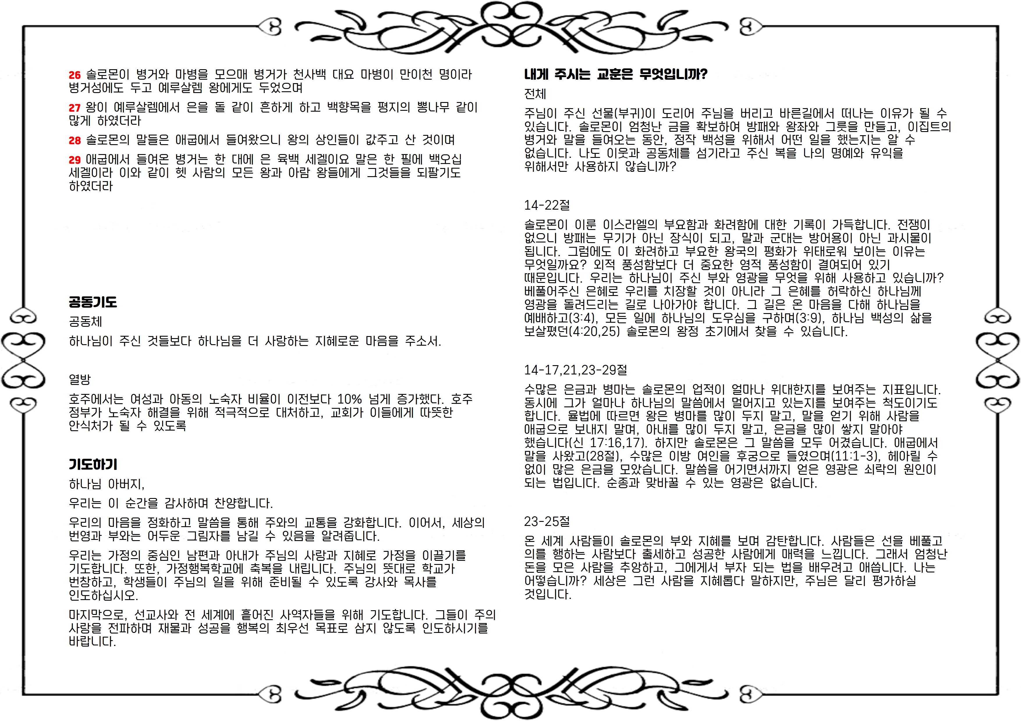 솔로몬이 이룬 이스라엘의 부요함과 화려함에 대한 기록이 가득합니다. 전쟁이 없으니 방패는 무기가 아닌 장식이 되고, 말과 군대는 방어용이 아닌 과시물이 됩니다. 그럼에도 이 화려하고 부요한 왕국의 평화가 위태로워 보이는 이유는 무엇일까요? 외적 풍성함보다 더 중요한 영적 풍성함이 결여되어 있기 때문입니다. 우리는 하나님이 주신 부와 영광을 무엇을 위해 사용하고 있습니까? 베풀어주신 은혜로 우리를 치장할 것이 아니라 그 은혜를 허락하신 하나님께 영광을 돌려드리는 길로 나아가야 합니다. 그 길은 온 마음을 다해 하나님을 예배하고(3:4), 모든 일에 하나님의 도우심을 구하며(3:9), 하나님 백성의 삶을 보살폈던(4:20,25) 솔로몬의 왕정 초기에서 찾을 수 있습니다.