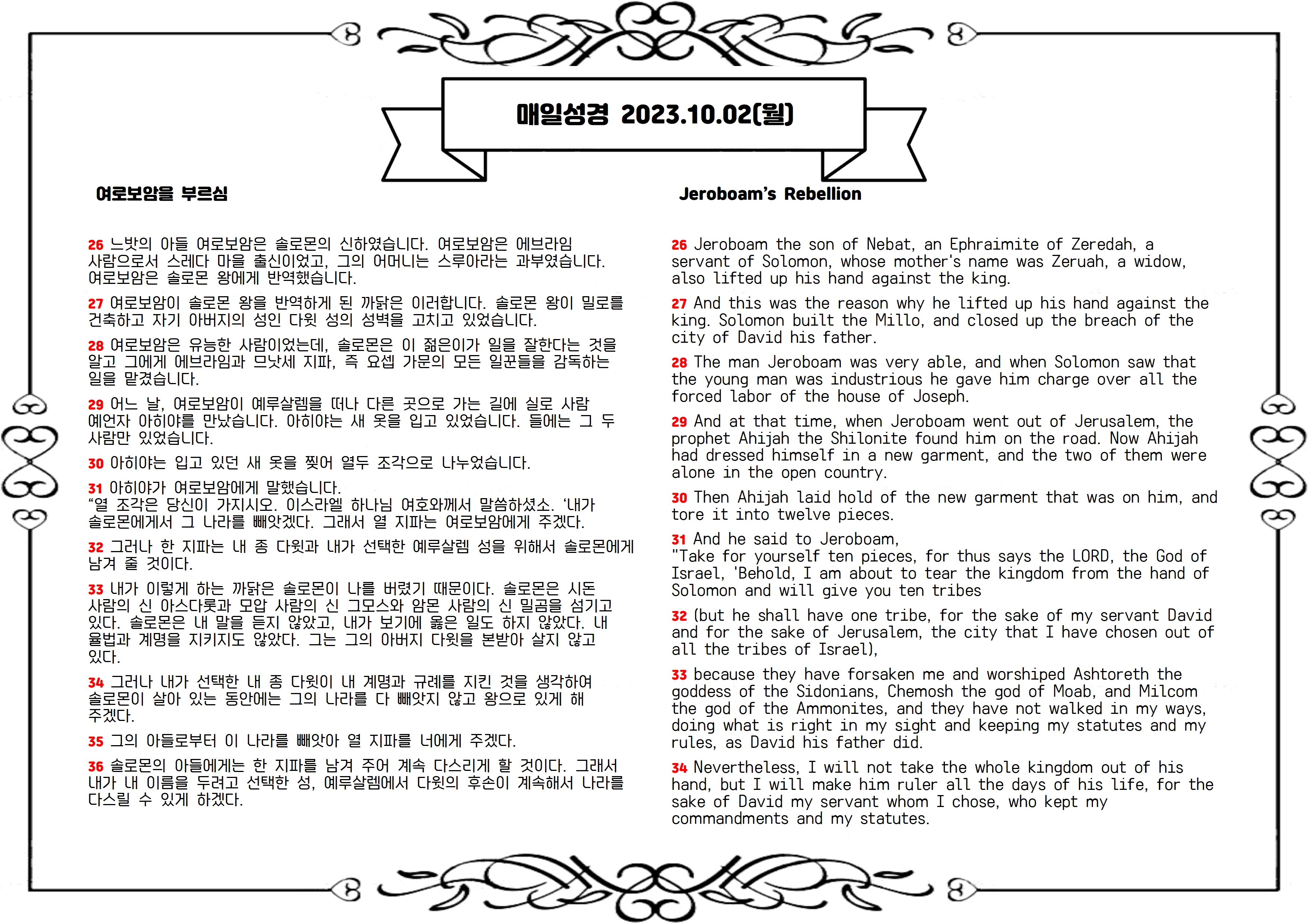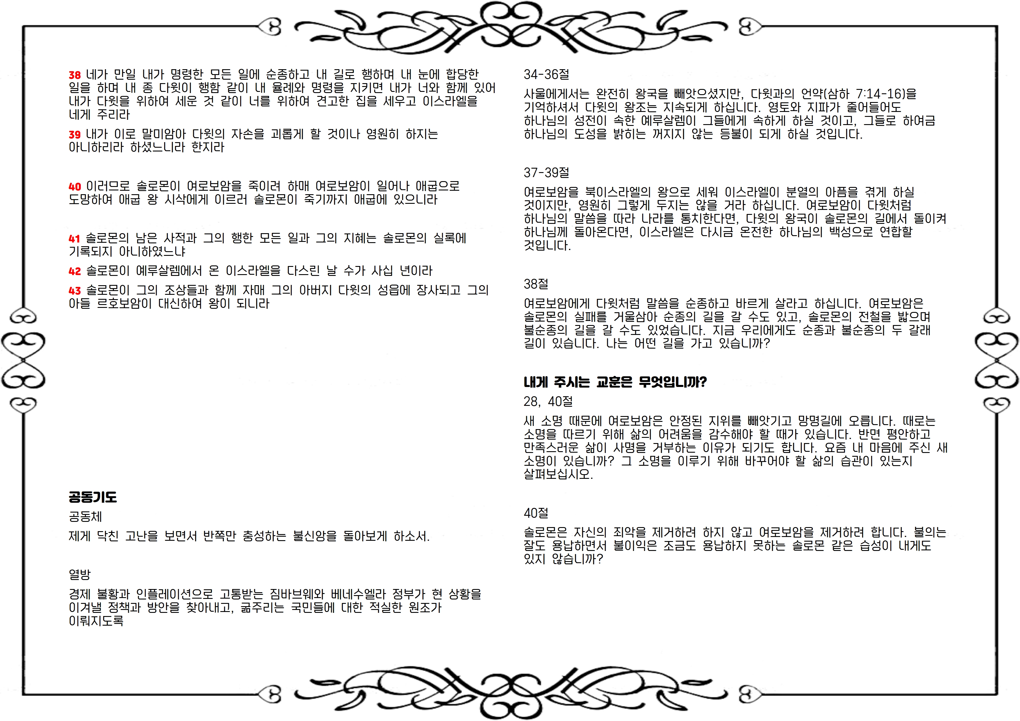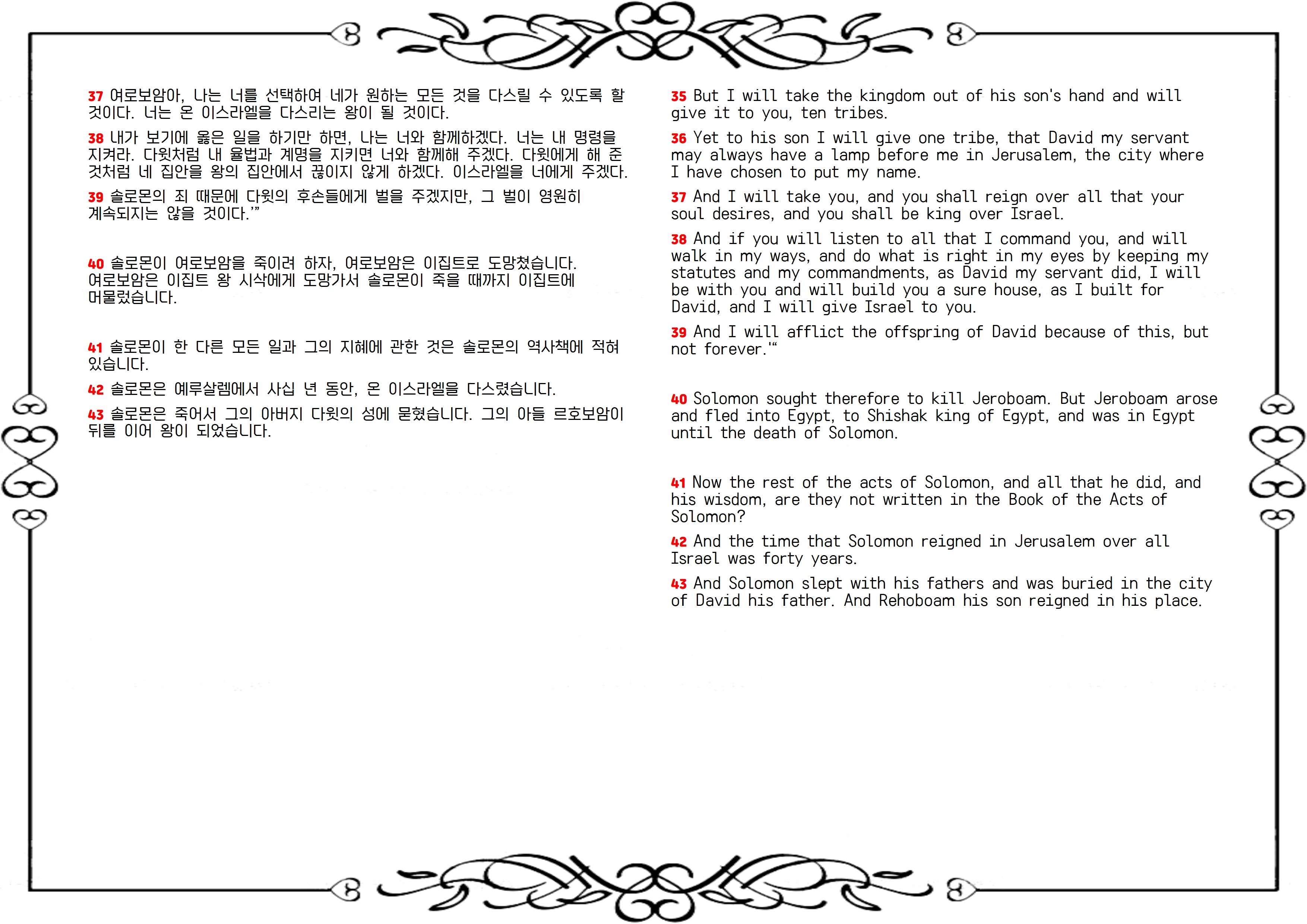 주님은 아히야 예언자를 그에게 보내 주님을 버리고 우상을 섬긴 솔로몬에게 죄와 심판을 선포하시고, 솔로몬의 왕국을 찢어 여로보암에게 열 지파를 넘겨주겠다고 말씀하십니다(30-36절). 주님은 여로보암이 다윗처럼 주님의 명령을 지키고 바르게 살면 그와 함께하시고, 그의 왕조를 견고하게 세워 주겠다고 약속하십니다(37-39절). 이후 여로보암은 솔로몬을 피해 이집트 왕에게로 망명합니다(40절). 솔로몬은 죽어서 다윗 성에 묻히고, 그의 아들 르호보암이 솔로몬을 이어 왕이 됩니다(41-43절).