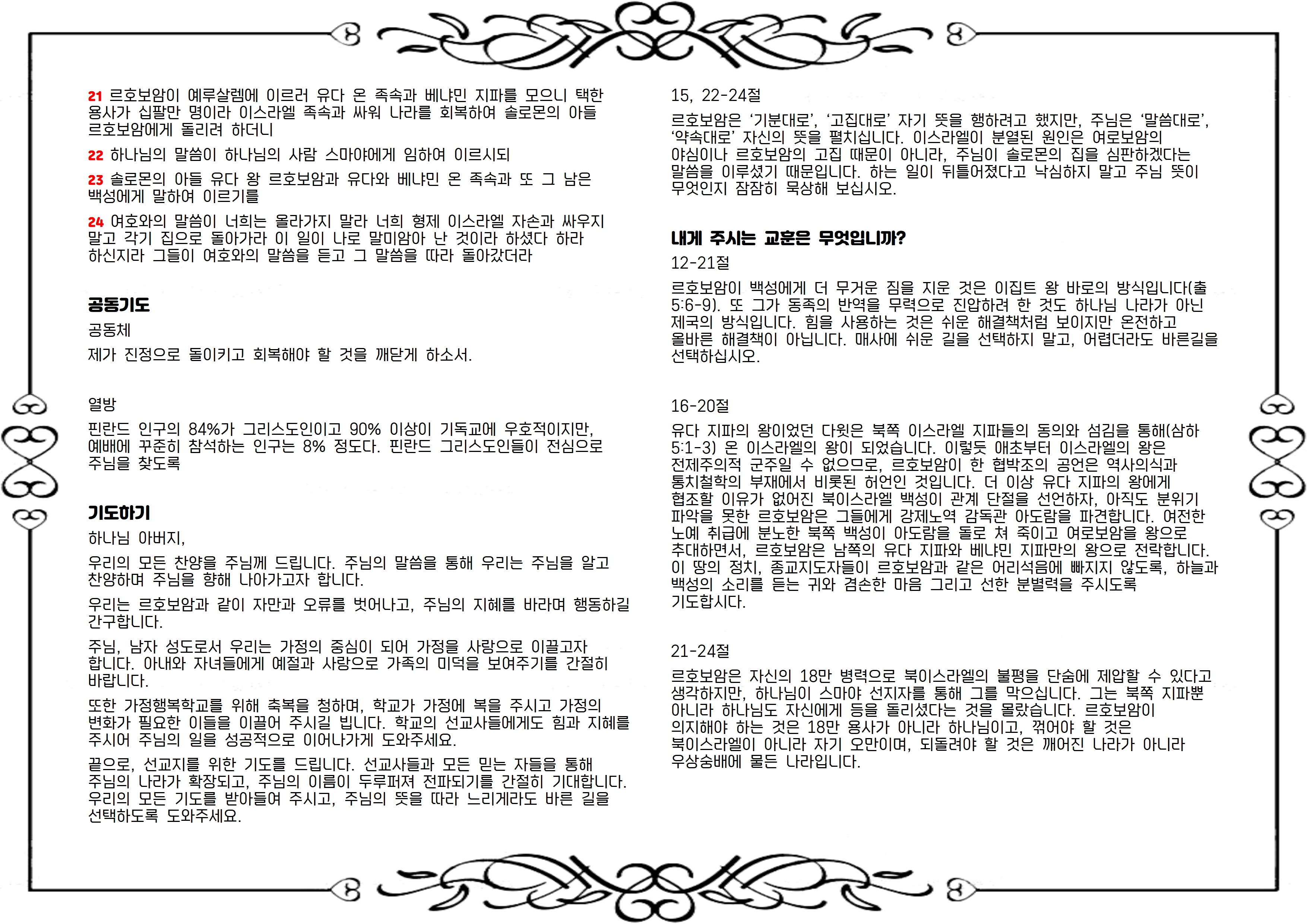유다 지파의 왕이었던 다윗은 북쪽 이스라엘 지파들의 동의와 섬김을 통해(삼하 5:1-3) 온 이스라엘의 왕이 되었습니다. 이렇듯 애초부터 이스라엘의 왕은 전제주의적 군주일 수 없으므로, 르호보암이 한 협박조의 공언은 역사의식과 통치철학의 부재에서 비롯된 허언인 것입니다. 더 이상 유다 지파의 왕에게 협조할 이유가 없어진 북이스라엘 백성이 관계 단절을 선언하자, 아직도 분위기 파악을 못한 르호보암은 그들에게 강제노역 감독관 아도람을 파견합니다. 여전한 노예 취급에 분노한 북쪽 백성이 아도람을 돌로 쳐 죽이고 여로보암을 왕으로 추대하면서, 르호보암은 남쪽의 유다 지파와 베냐민 지파만의 왕으로 전락합니다. 이 땅의 정치, 종교지도자들이 르호보암과 같은 어리석음에 빠지지 않도록, 하늘과 백성의 소리를 듣는 귀와 겸손한 마음 그리고 선한 분별력을 주시도록 기도합시다.