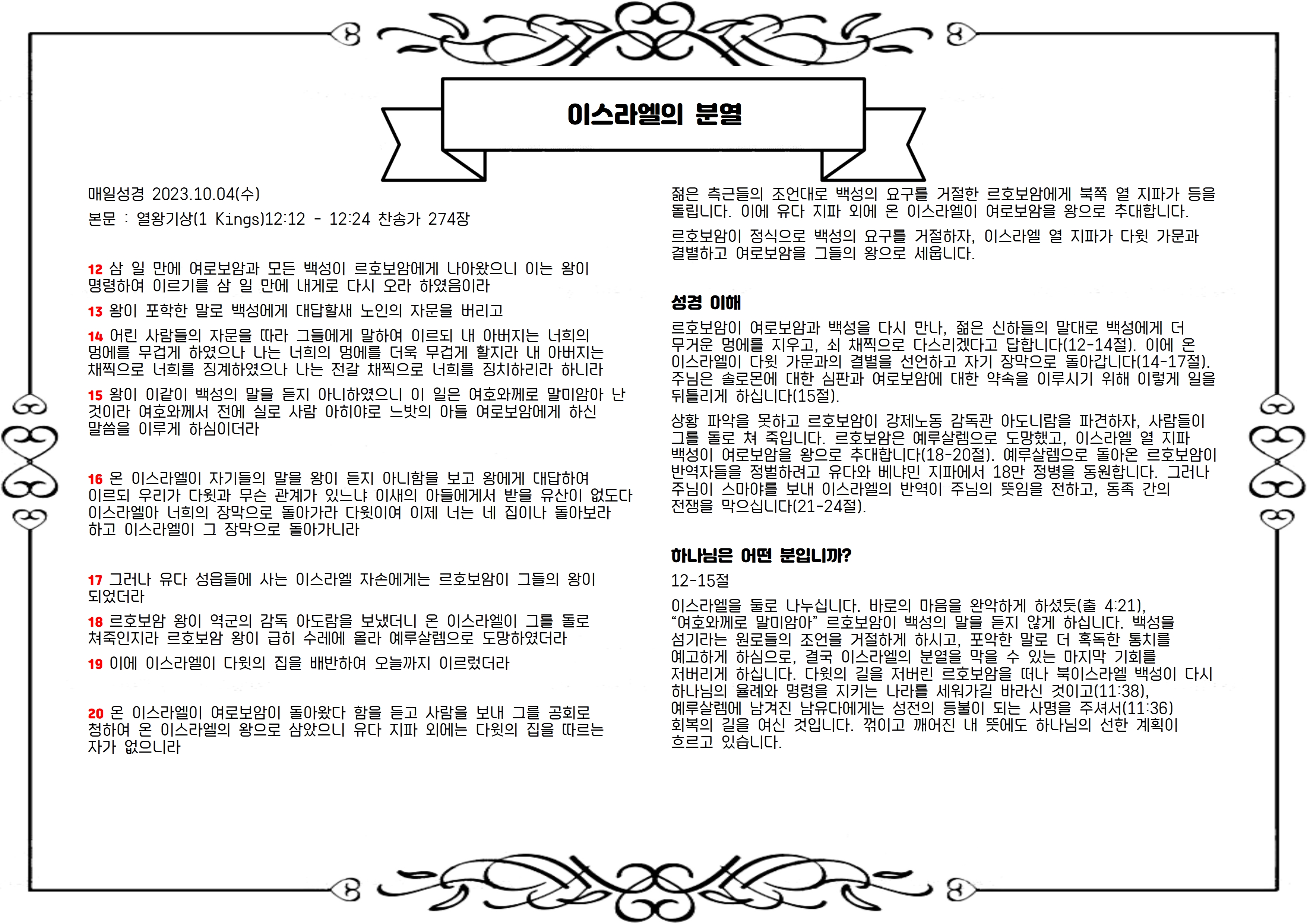 르호보암이 여로보암과 백성을 다시 만나, 젊은 신하들의 말대로 백성에게 더 무거운 멍에를 지우고, 쇠 채찍으로 다스리겠다고 답합니다(12-14절). 이에 온 이스라엘이 다윗 가문과의 결별을 선언하고 자기 장막으로 돌아갑니다(14-17절). 주님은 솔로몬에 대한 심판과 여로보암에 대한 약속을 이루시기 위해 이렇게 일을 뒤틀리게 하십니다(15절).