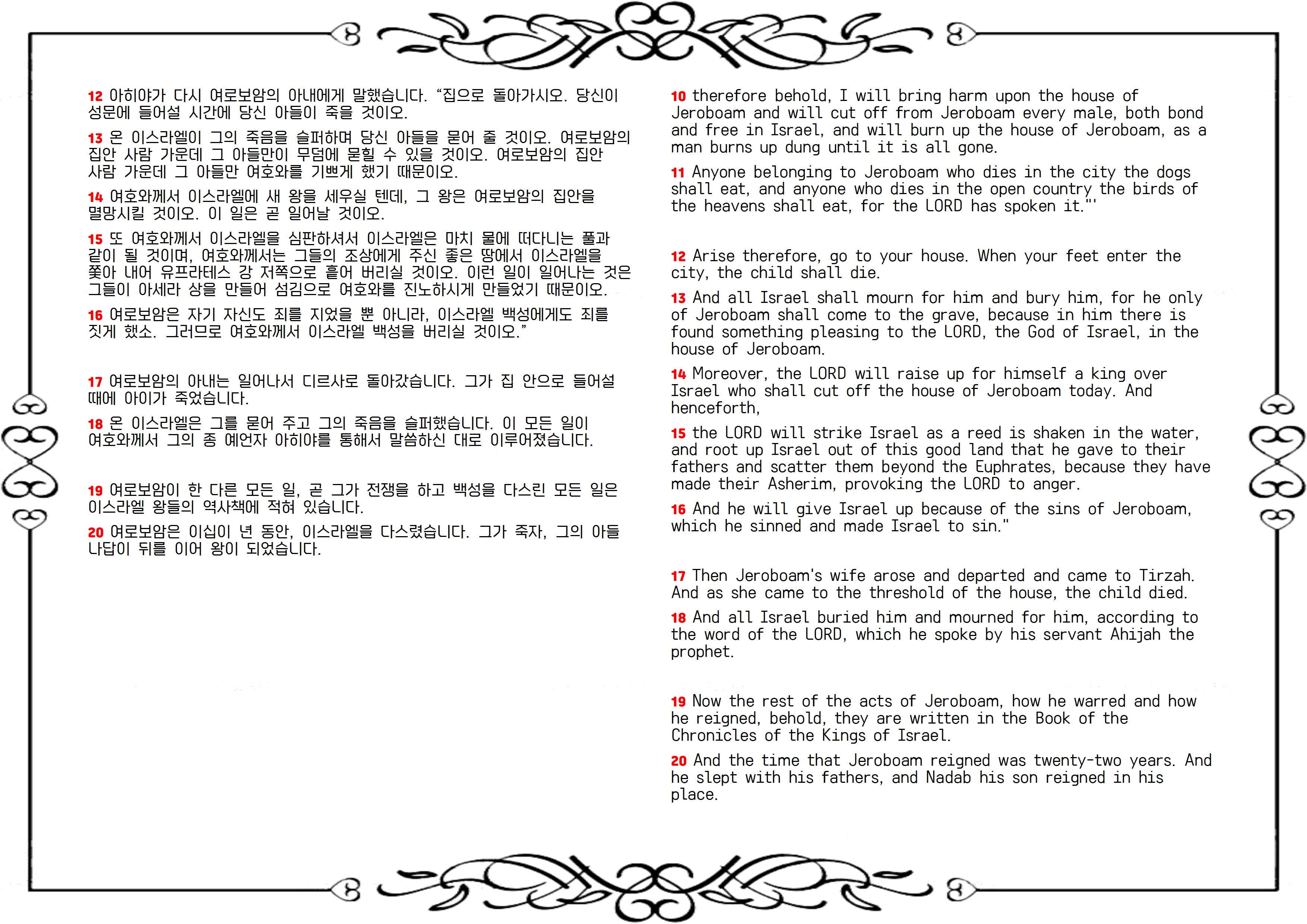 여로보암은 주님과 맺은 약속을 저버리고 우상을 섬겼고, 자신뿐만 아니라 이스라엘 온 백성을 그릇된 길로 인도했습니다. 이제 주님이 여로보암의 집안과 그를 따라 범죄한 이스라엘 백성을 심판하실 것입니다. 여로보암의 집안 남자들은 모두 비참하게 죽을 것이고, 북 왕국 백성도 열방으로 뿔뿔이 흩어질 것입니다(10-16절). 여로보암의 아내가 돌아왔을 때, 아히야의 말대로 아이가 죽습니다(17, 18절).