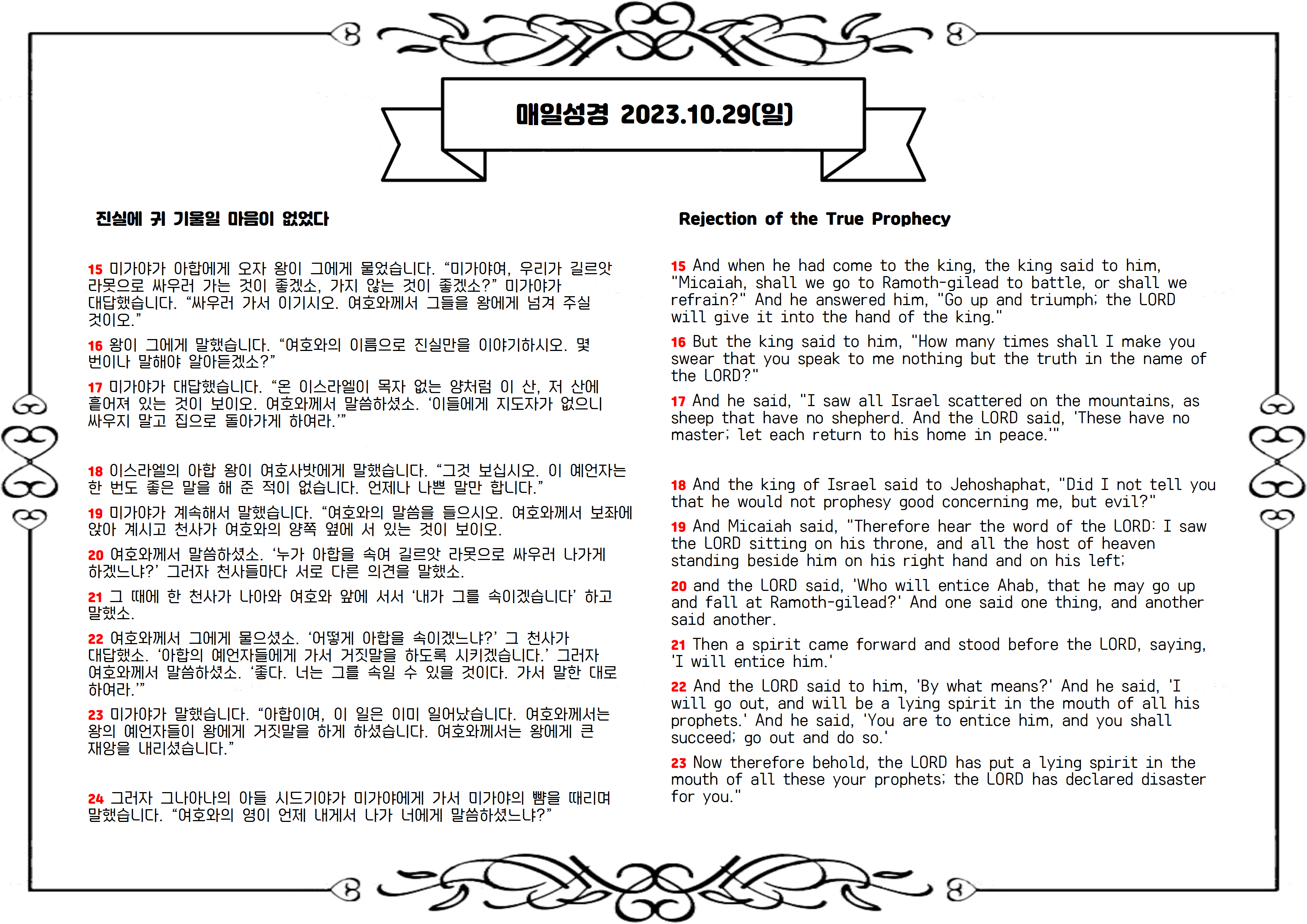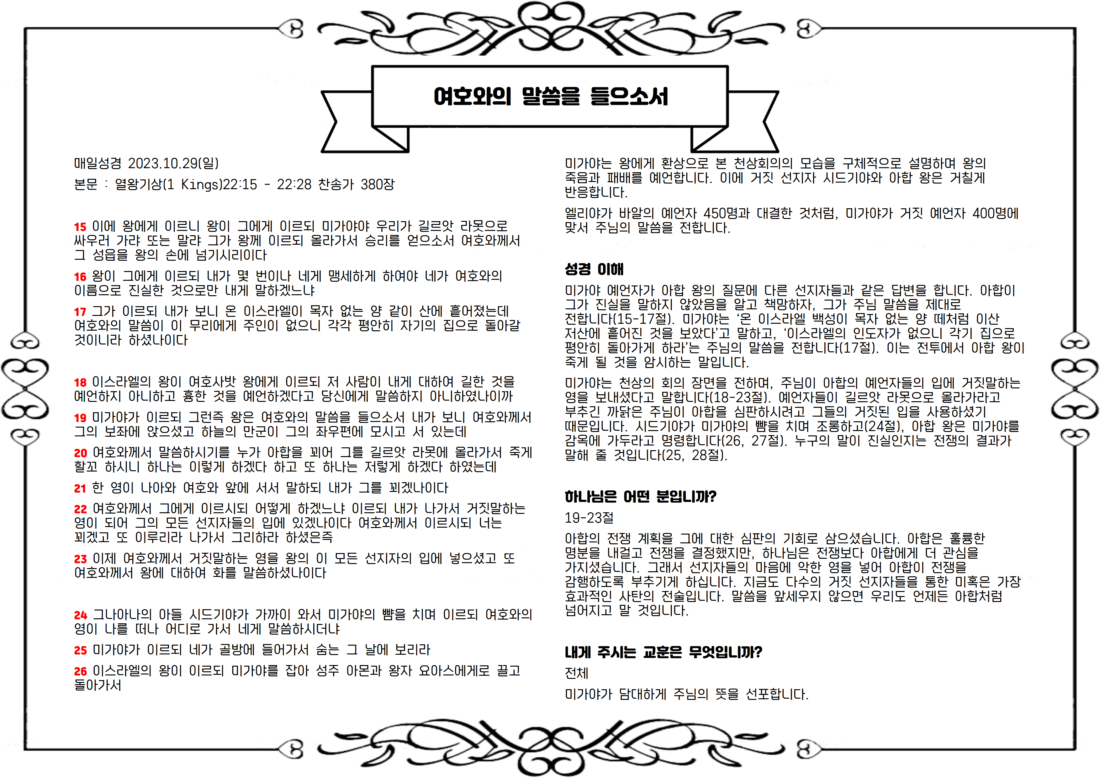 미가야는 자신의 말을 믿지 않는 아합 왕에게 거짓 선지자들을 흉내 내어 듣기 좋은 예언을 합니다. 하지만 다시 한번 진실을 말하라고 요구받자 그는 전쟁에서 왕이 죽고 백성은 도망하여 뿔뿔이 흩어지리라고 예언합니다. 듣고 싶고 듣기 좋은 것만 들으려는 사람에게 가장 큰 재앙은 듣기 좋은 메시지만 들려주는 것입니다. 평안은 말씀의 ‘내용’이 아니라 말씀의 ‘순종’에 달려 있습니다. 쓴 말씀을 달게 받아야 합니다(겔 3:3).
