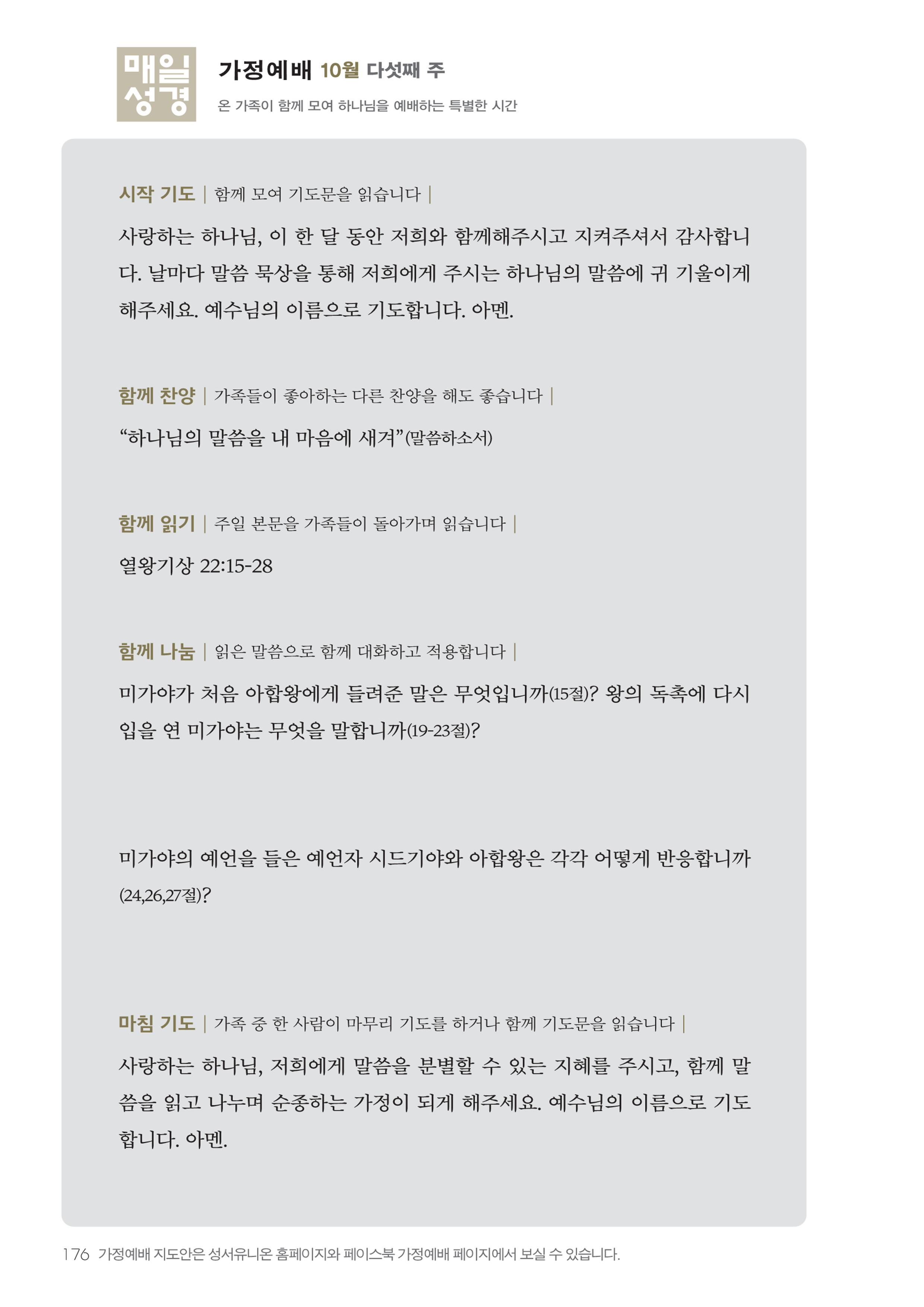 우리는 항상 감사하며 주님을 찬양하고, 주님의 현재와 미래를 알게 하소서. 우리는 주님의 말씀을 읽고 듣고자 합니다. 미가야의 예언과 주님의 진리에 귀를 기울이게 하여 주시옵소서.