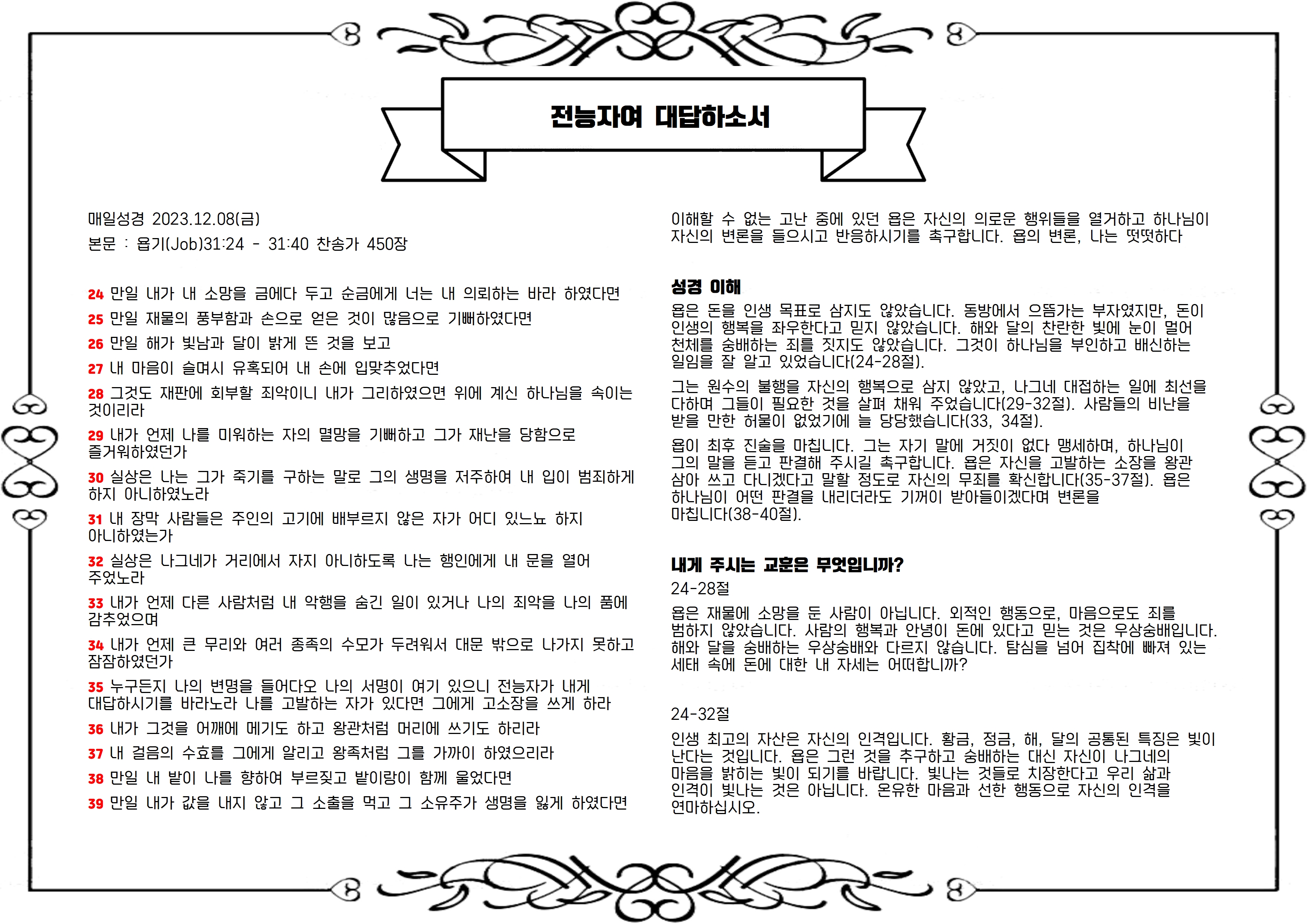 본문 : 욥기(Job)31:24 - 31:40 찬송가 450장