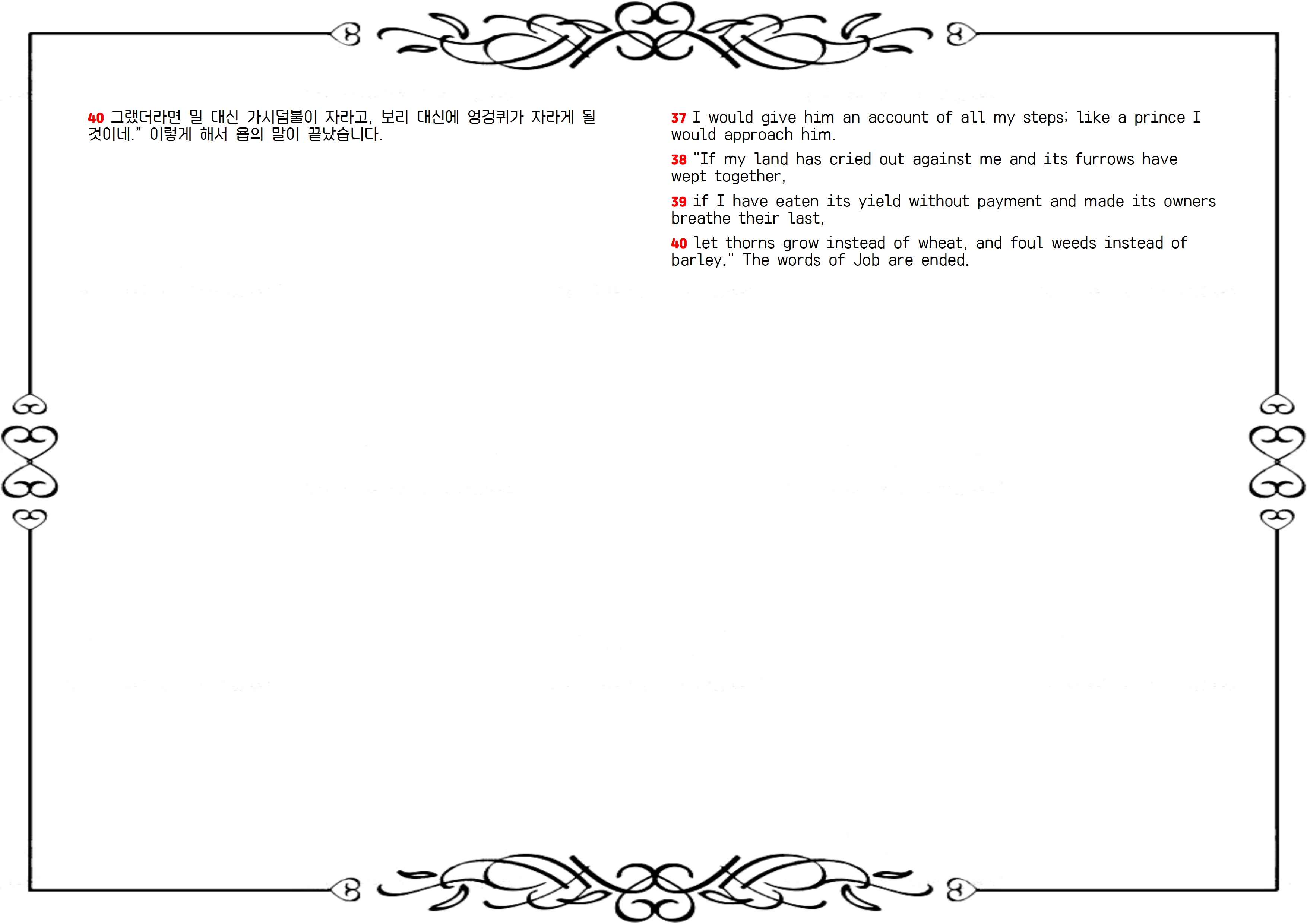 40 그랬더라면 밀 대신 가시덤불이 자라고, 보리 대신에 엉겅퀴가 자라게 될 것이네.” 이렇게 해서 욥의 말이 끝났습니다.