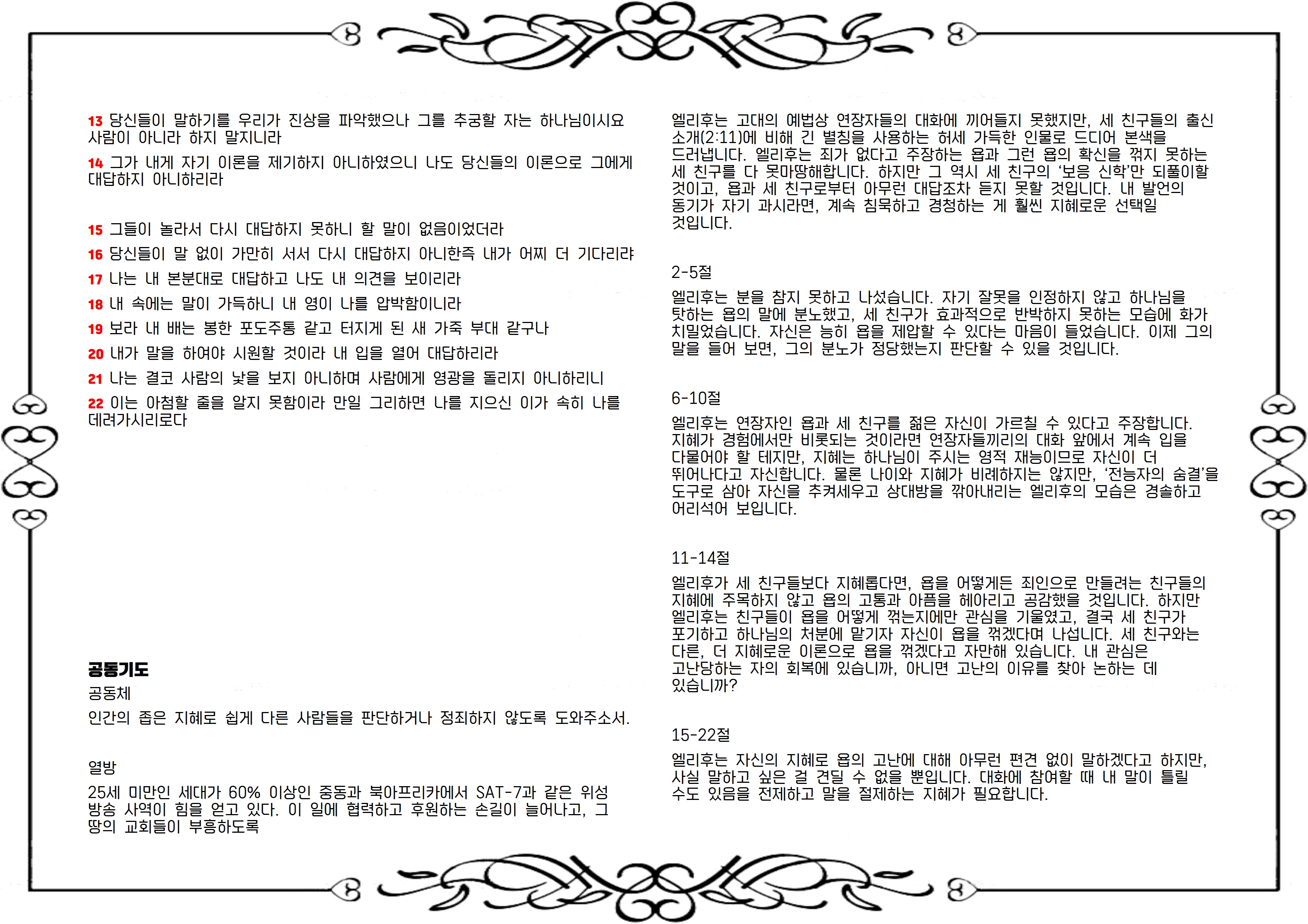 본문 : 욥기(Job)32:1 - 32:22 찬송가 366장