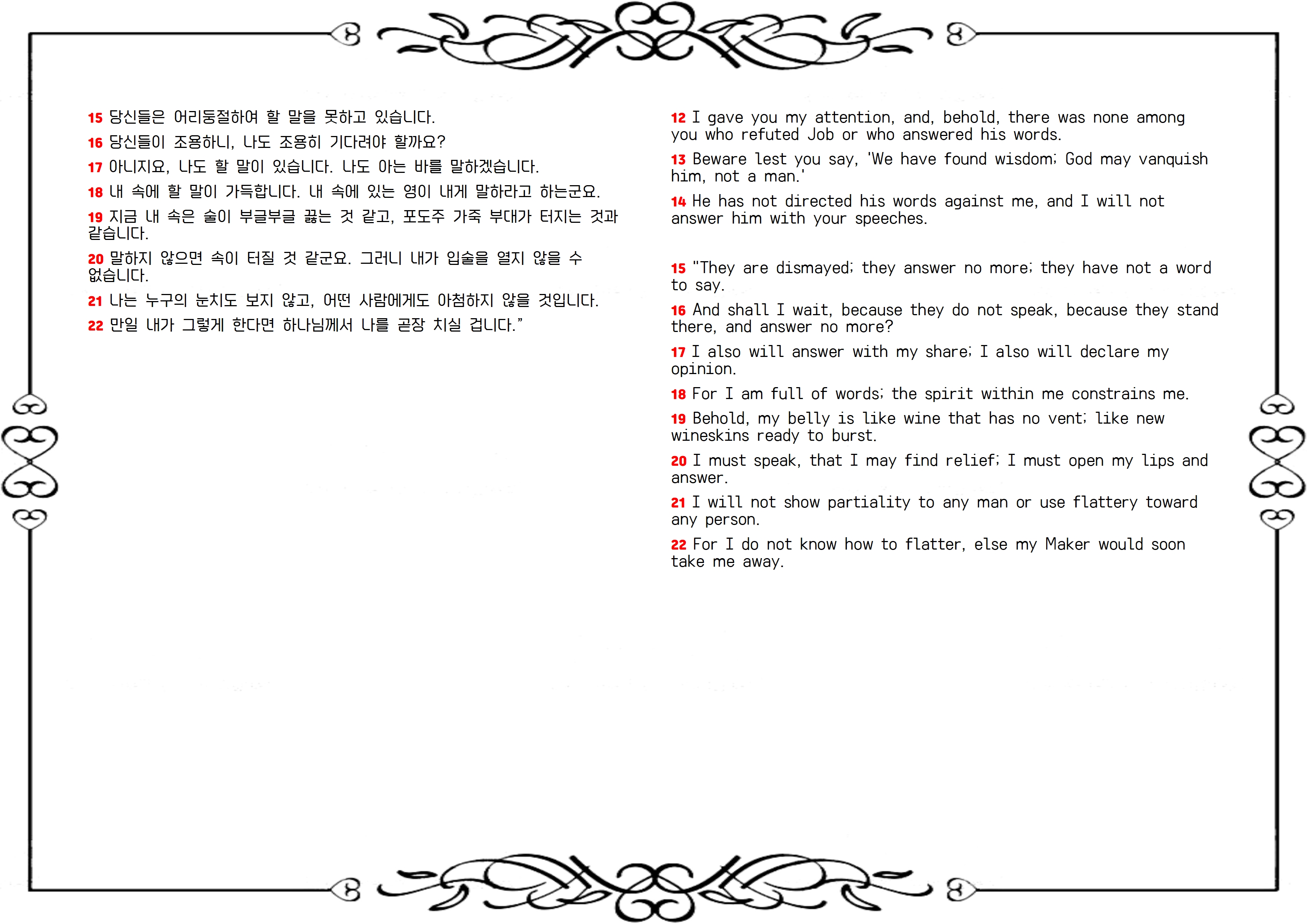 엘리후는 ‘하나님의 대답’을 욥에게 들려주겠다고 합니다. 그는 더 참고 있다가는 새 포도주가 부풀어 터지듯 자기 가슴도 터질 것 같다며 그의 생각을 말하겠다고 하고(14-20절), 자기 말이 누구 편을 들거나 사람에게 아첨할 의도가 없다고 전제합니다(21, 22절).