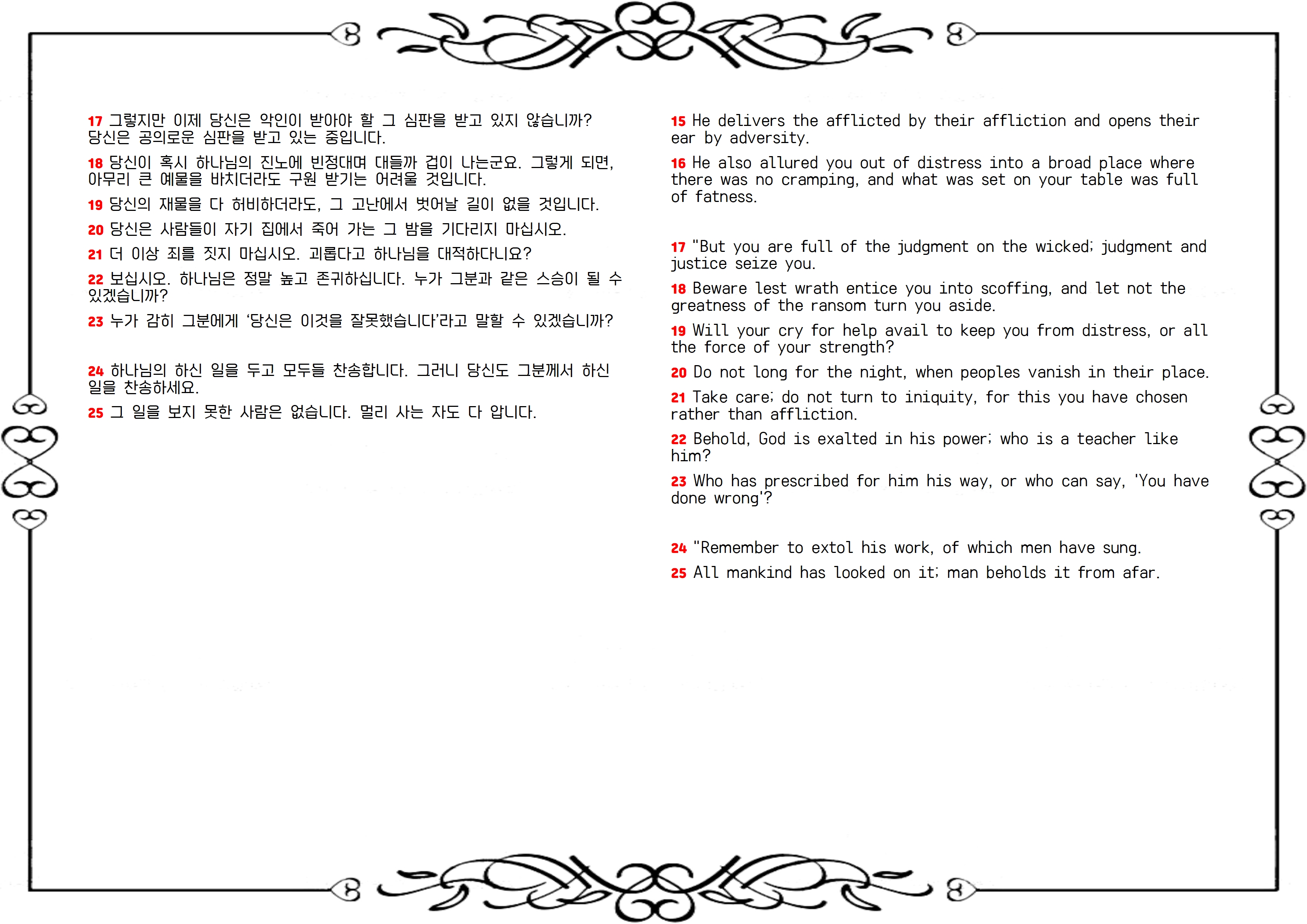 엘리후가 ‘하나님을 대신하여’ 말하겠다고 하고, 그의 ‘건전한 지식’으로 하나님이 의롭다는 사실을 증명하겠다고 선언합니다(1-4절). 엘리후는 하나님이 의인을 보살피고 악인을 벌하시는 분이고, 또 복종하지 않는 이들을 돌이키려고 고난을 주시는 분이라고 합니다. 하나님이 이처럼 의롭고 자비로운 분인데, 욥이 불경스럽게 자신이 처한 고난의 상황을 두고 분노한다는 것입니다(5-13절).