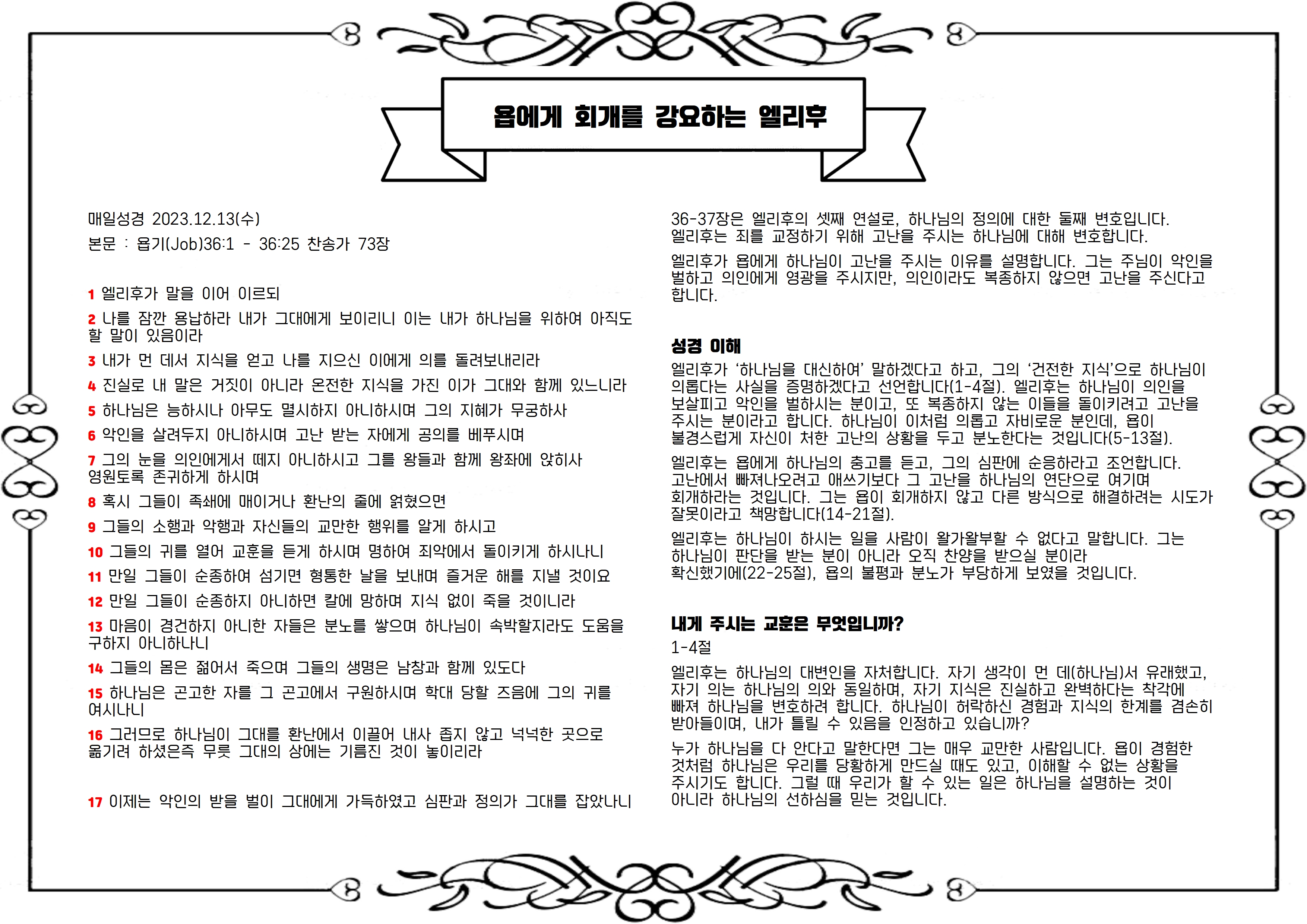 본문 : 욥기(Job)36:1 - 36:25 찬송가 73장