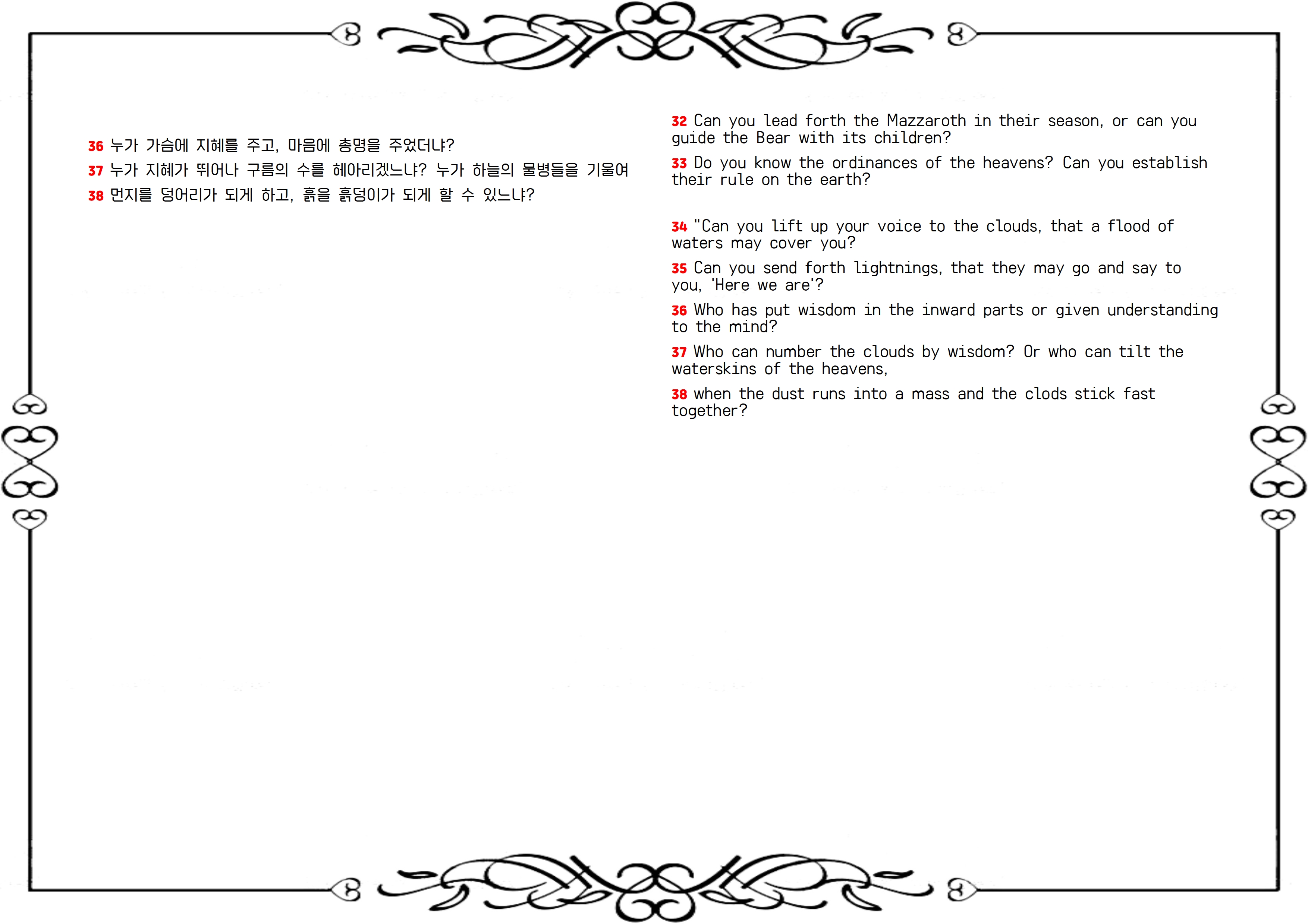 하나님이 욥에게 자연의 현상, 창조된 세계, 그리고 우주의 운영과정에 관한 일련의 질문을 던지는 부분입니다. 이 문구들은 하나님의 전능과 지혜를 강조하면서, 인간이 이러한 복잡하고 원대한 창조물들을 이해하고 통제할 수 없다는 사실을 알리고 있습니다.