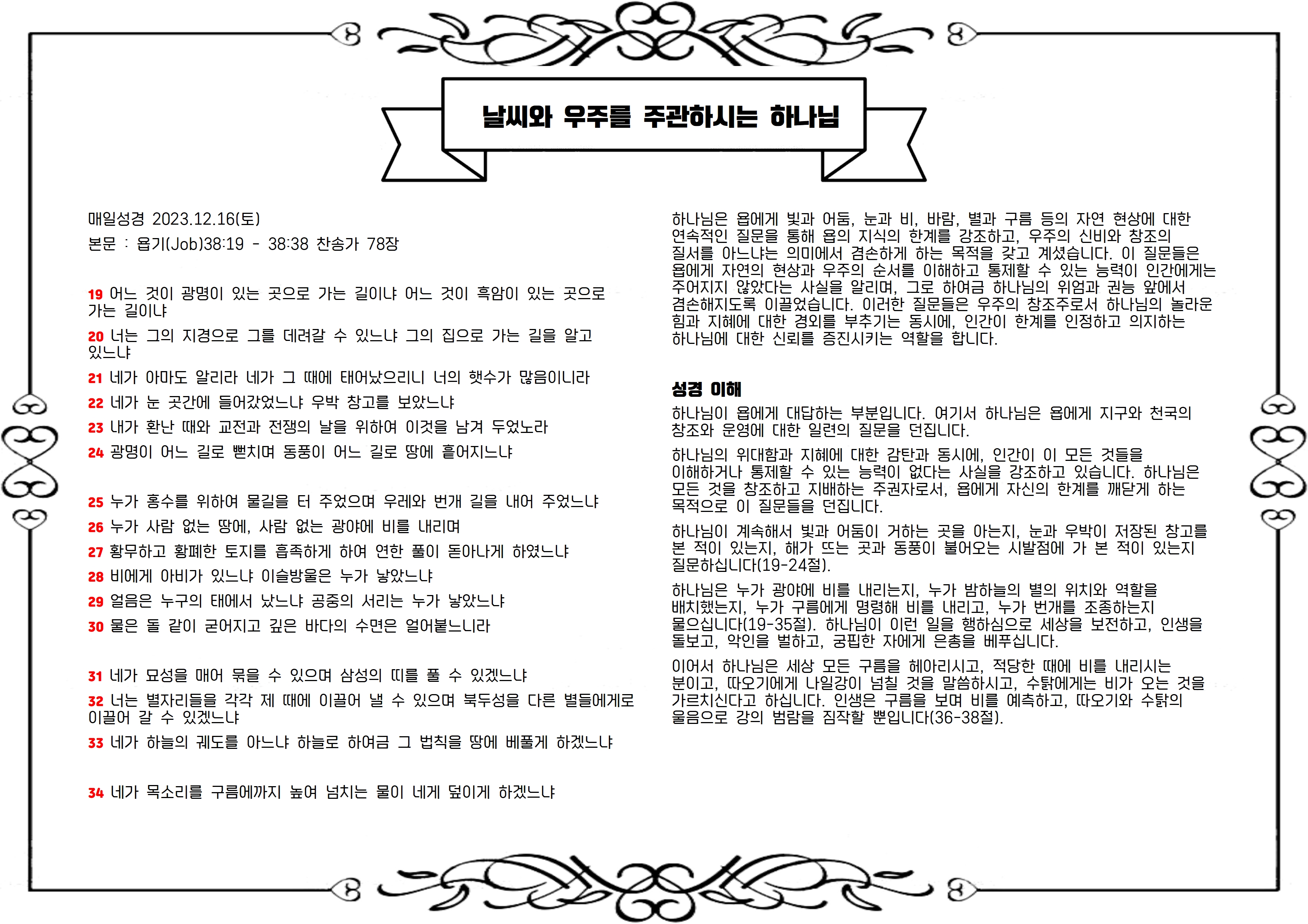 하나님은 누가 광야에 비를 내리는지, 누가 밤하늘의 별의 위치와 역할을 배치했는지, 누가 구름에게 명령해 비를 내리고, 누가 번개를 조종하는지 물으십니다(19-35절). 하나님이 이런 일을 행하심으로 세상을 보전하고, 인생을 돌보고, 악인을 벌하고, 궁핍한 자에게 은총을 베푸십니다.