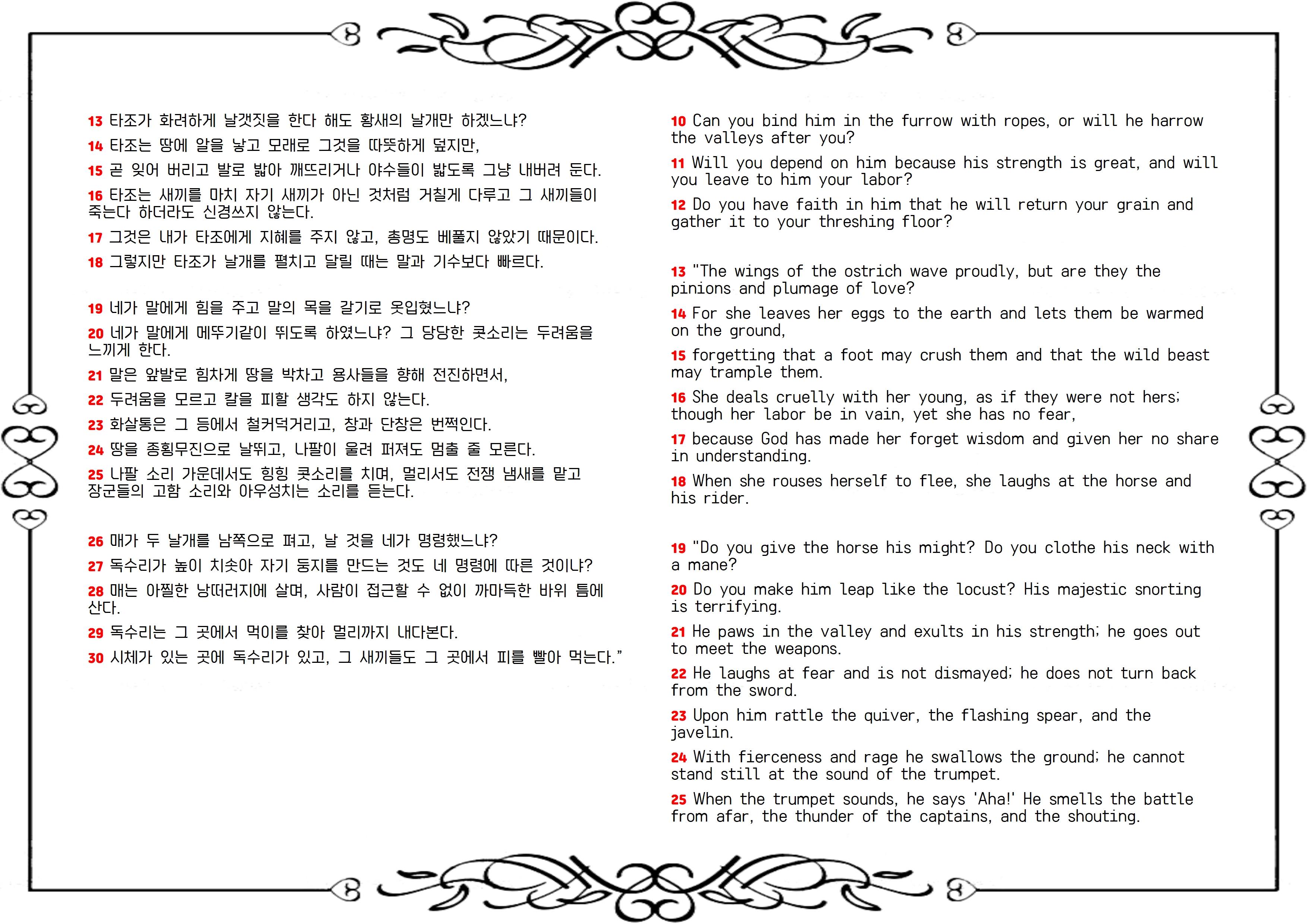 욥 39:13-18 - 말의 능력과 타조의 특성: 말의 능력과 타조의 특성에 대한 질문을 통해 각 동물이 받은 고유의 능력과 특성을 보여주며, 창조된 모든 것이 하나님의 지혜에 의해 조화롭게 운영되고 있다는 것을 강조합니다.