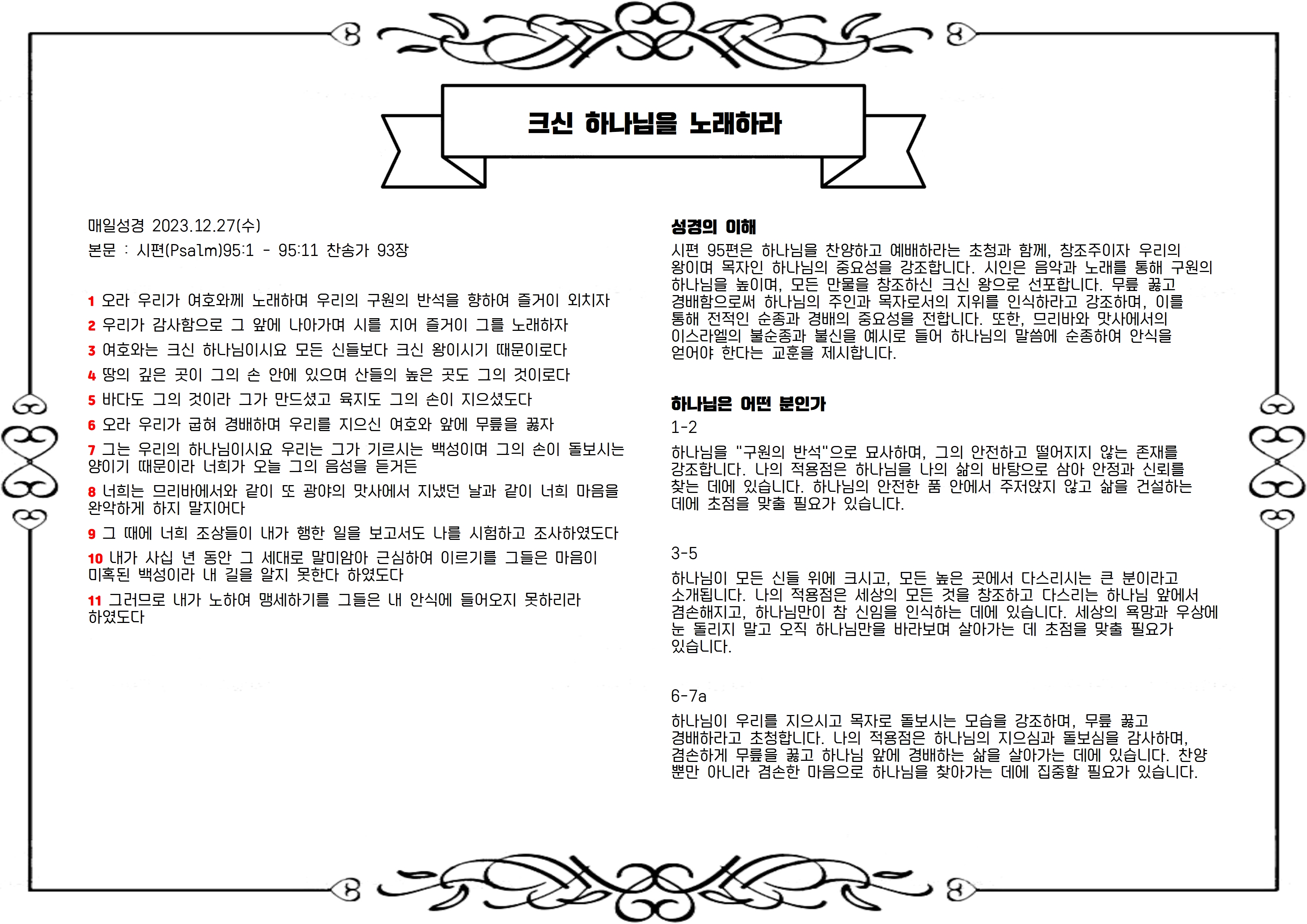 본문 : 시편(Psalm)95:1 - 95:11 찬송가 93장