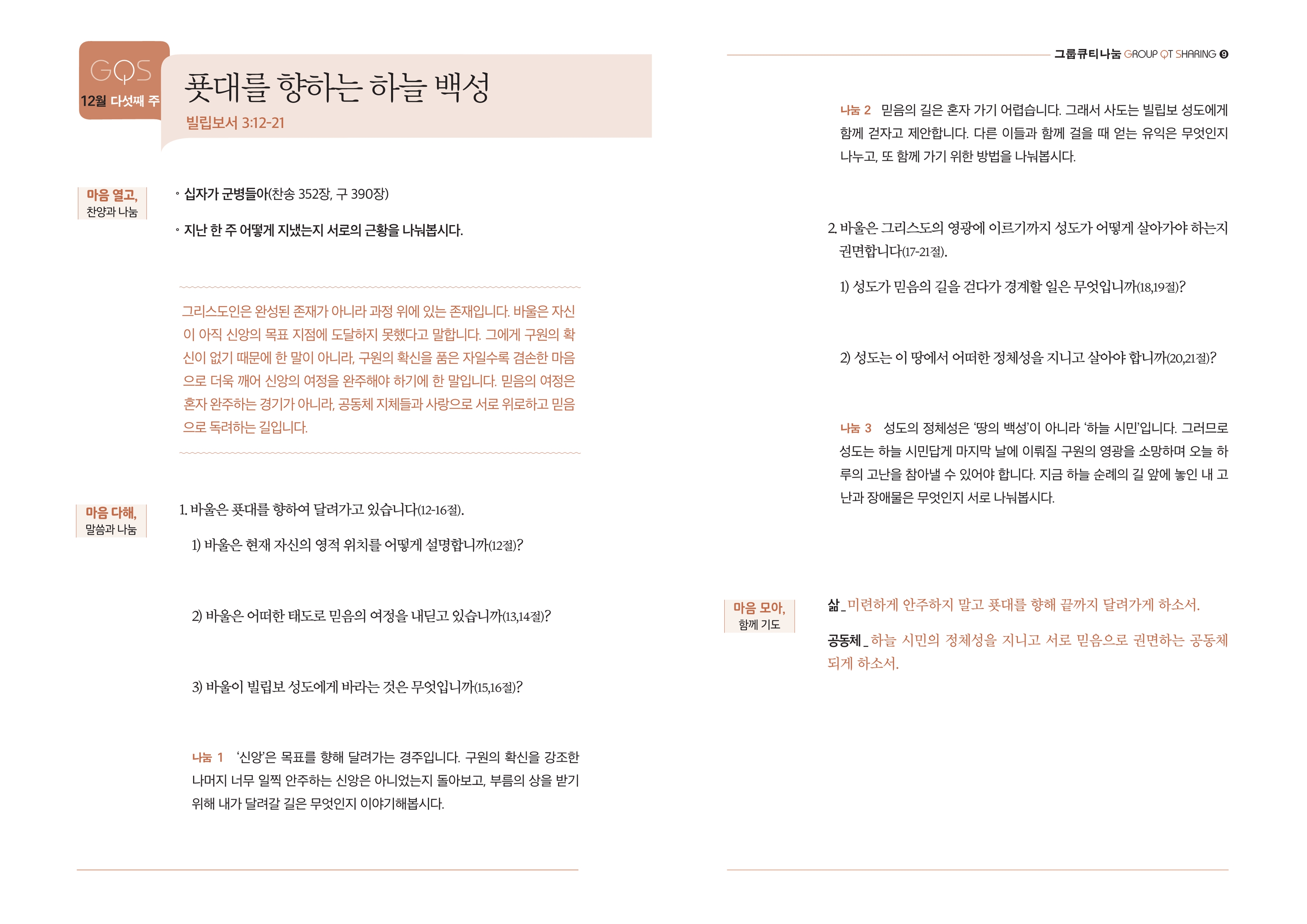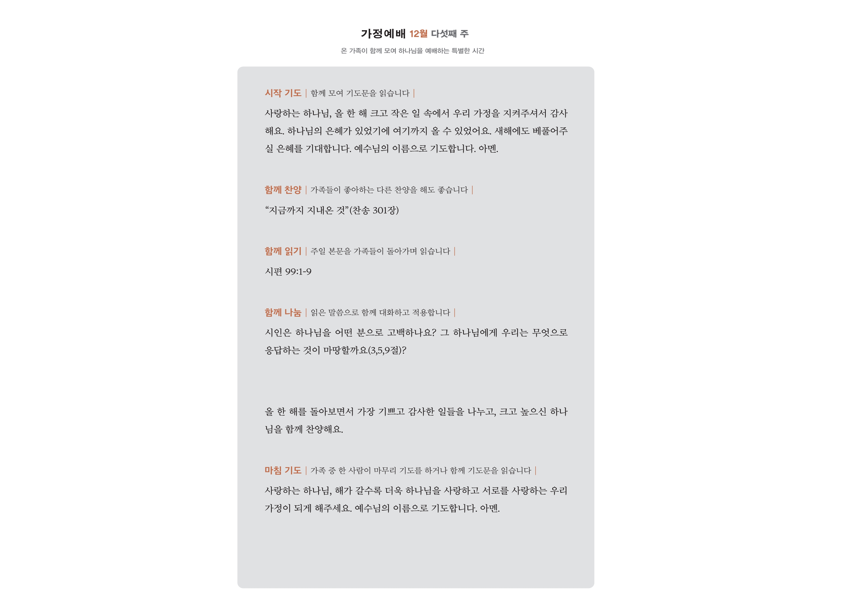 우리 교회인 수영로교회를 주님의 나라의 완성과 확장을 위한 도구로 키우시고, 제자들이 복음을 전하고 실천하며 주님을 따라가도록 기도합니다. 또한 연말연초 특새와 송구영신 예배를 통해 각 성도가 한 해를 은혜로 마무리하고 새해에는 성령 충만한 삶을 살도록 도우시기를 기도합니다.