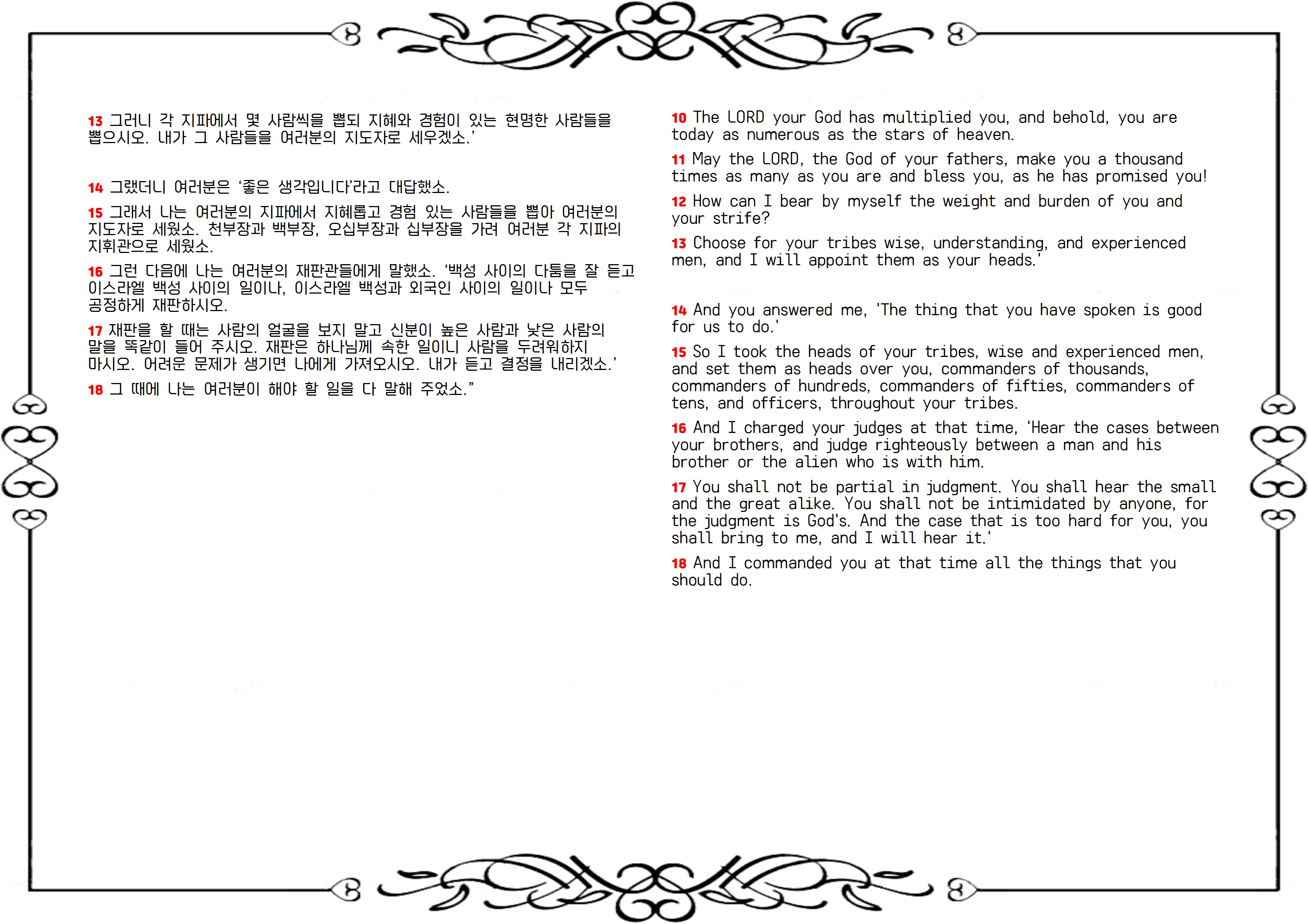 16 내가 그 때에 너희의 재판장들에게 명하여 이르기를 너희가 너희의 형제 중에서 송사를 들을 때에 쌍방간에 공정히 판결할 것이며 그들 중에 있는 타국인에게도 그리 할 것이라