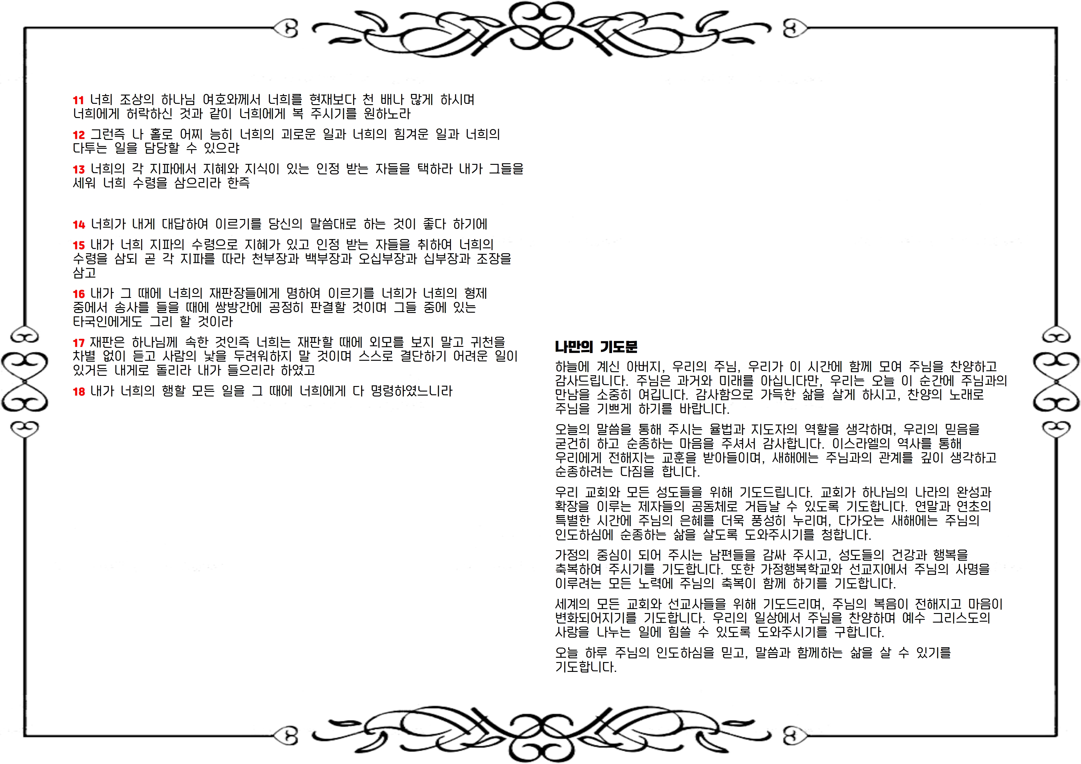 우리 교회와 모든 성도들을 위해 기도드립니다. 교회가 하나님의 나라의 완성과 확장을 이루는 제자들의 공동체로 거듭날 수 있도록 기도합니다. 연말과 연초의 특별한 시간에 주님의 은혜를 더욱 풍성히 누리며, 다가오는 새해에는 주님의 인도하심에 순종하는 삶을 살도록 도와주시기를 청합니다.