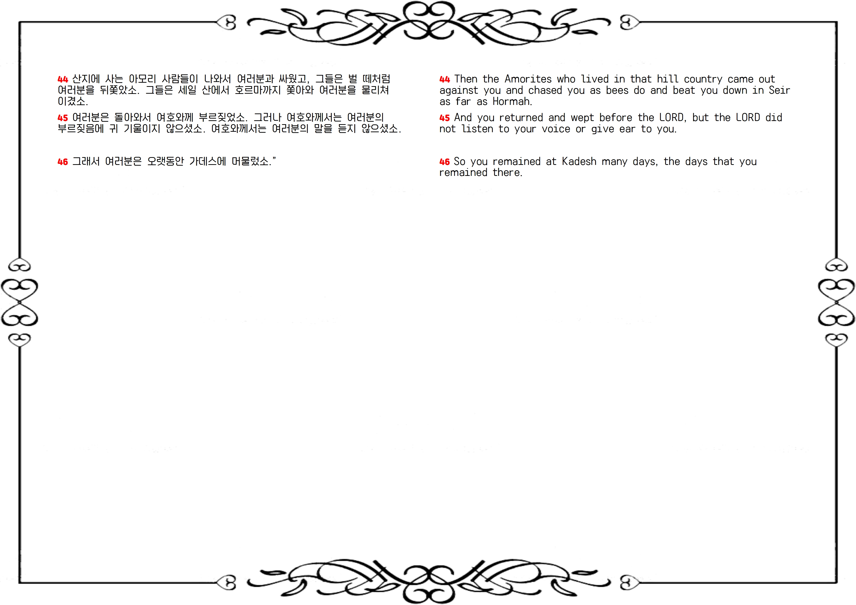 46 너희가 가데스에 여러 날 동안 머물렀나니 곧 너희가 그 곳에 머물던 날 수대로니라