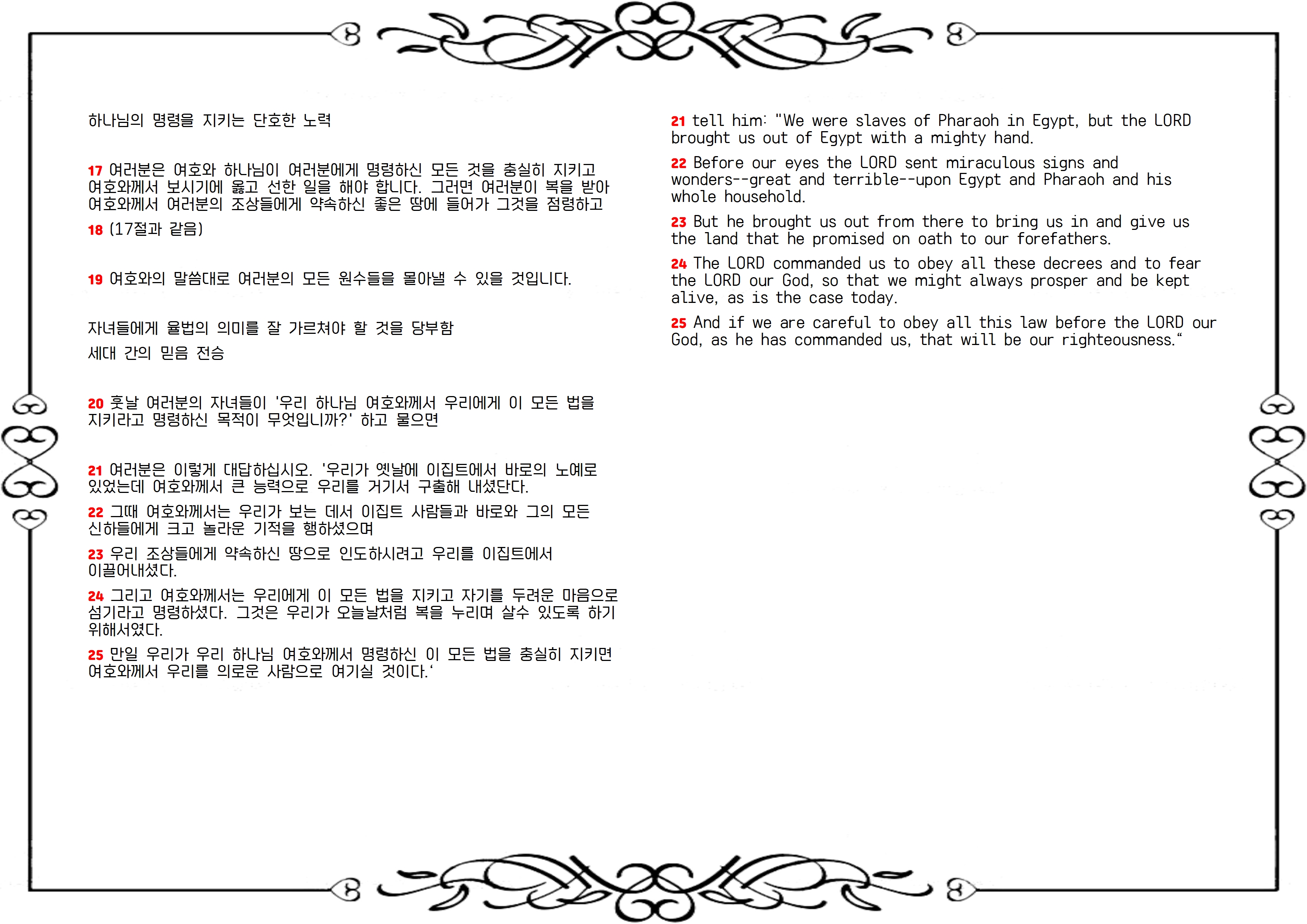 25 우리가 그 명령하신 대로 이 모든 명령을 우리 하나님 여호와 앞에서 삼가 지키면 그것이 곧 우리의 의로움이니라 할지니라