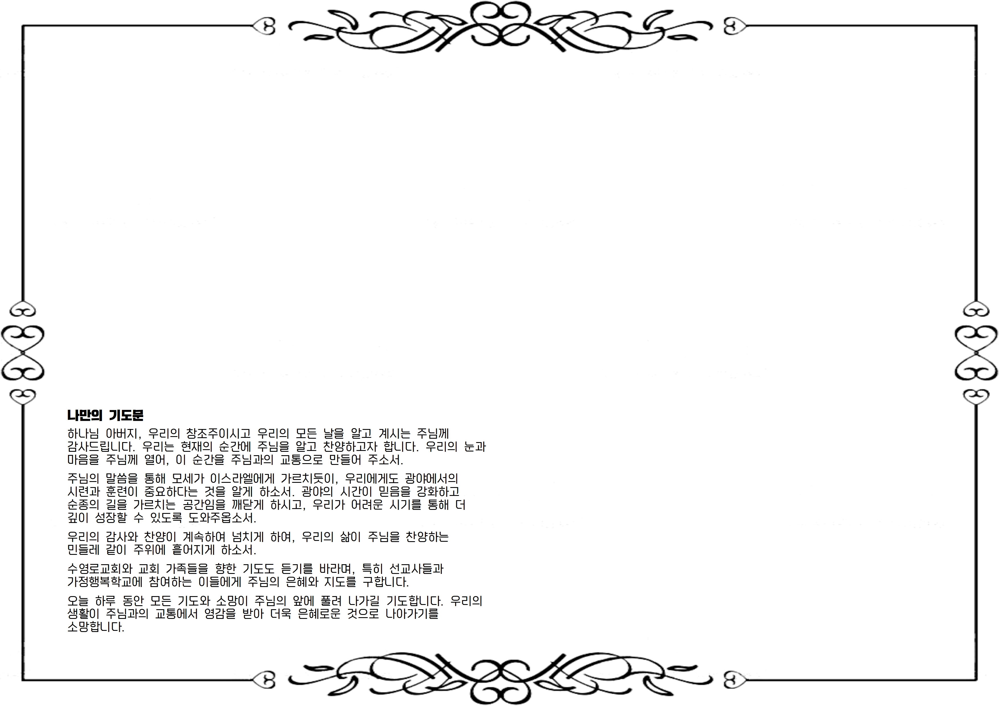 수영로교회와 교회 가족들을 향한 기도도 듣기를 바라며, 특히 선교사들과 가정행복학교에 참여하는 이들에게 주님의 은혜와 지도를 구합니다.
