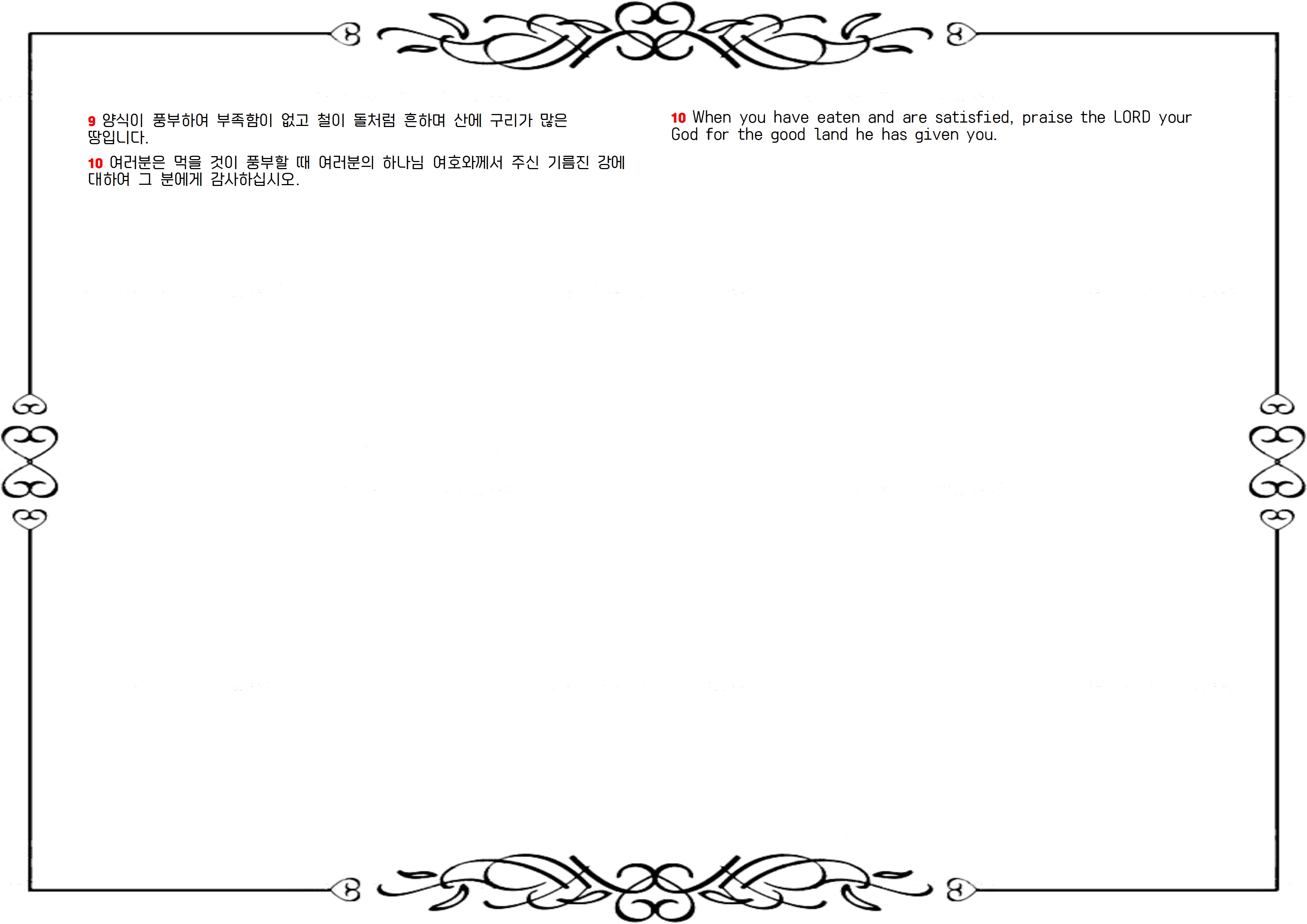 10 여러분은 먹을 것이 풍부할 때 여러분의 하나님 여호와께서 주신 기름진 강에 대하여 그 분에게 감사하십시오.