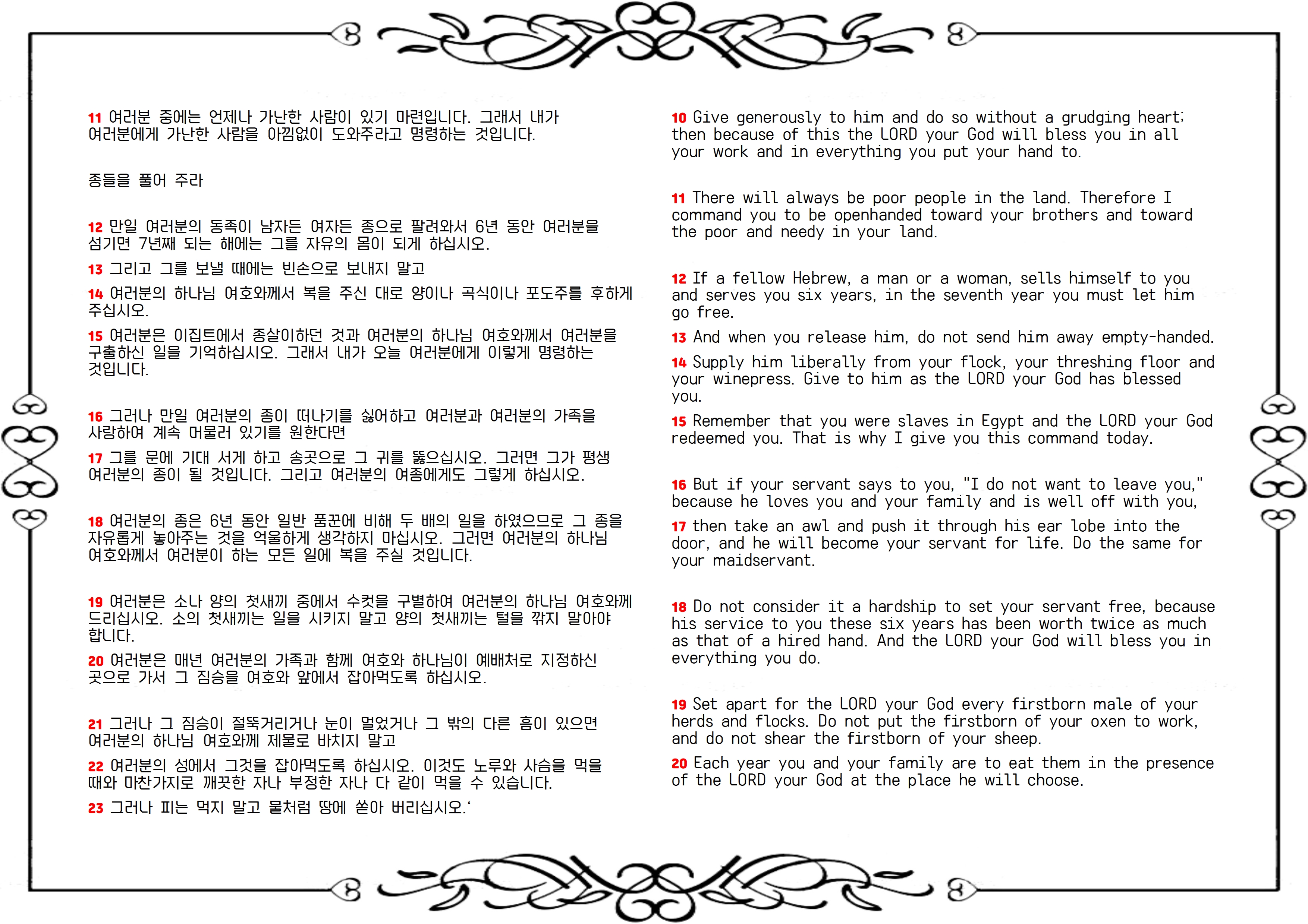 매 7년 끝에는 빚을 면제하라고 명령하시며, 주님은 동족에게 인색한 마음으로 대하지 말고, 그가 필요한 만큼 빌려주라고 하십니다. 돌려받지 못할 것이 두려워 동족을 냉대하면, 반드시 징계하겠다고 말씀하십니다. 주님은 이렇게 하는 것이 손해가 아니라고 하십니다. 오히려 가난한 동족을 보살핀 사람에게 복을 더하겠다고 약속하십니다.