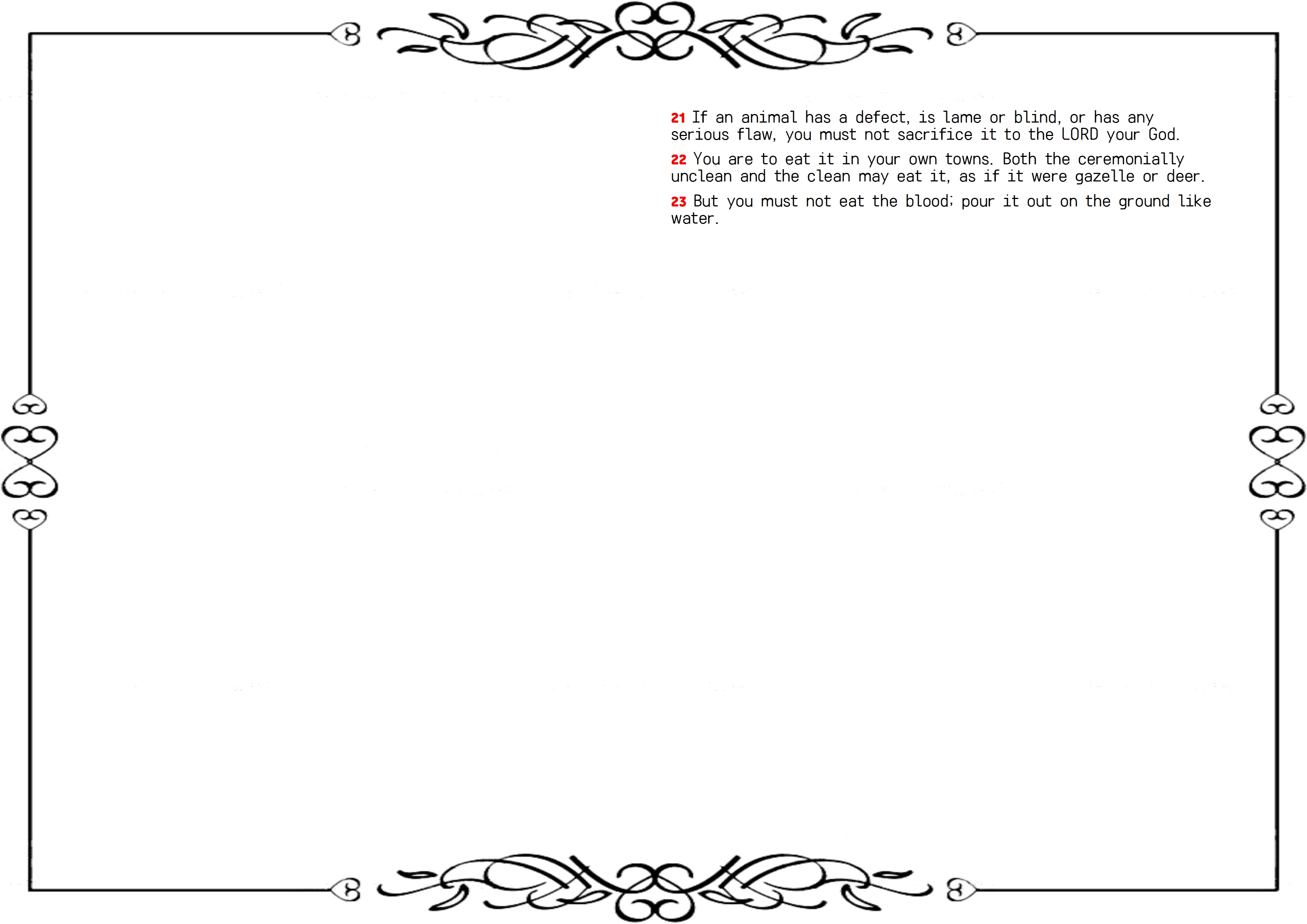 21 If an animal has a defect, is lame or blind, or has any serious flaw, you must not sacrifice it to the LORD your God.