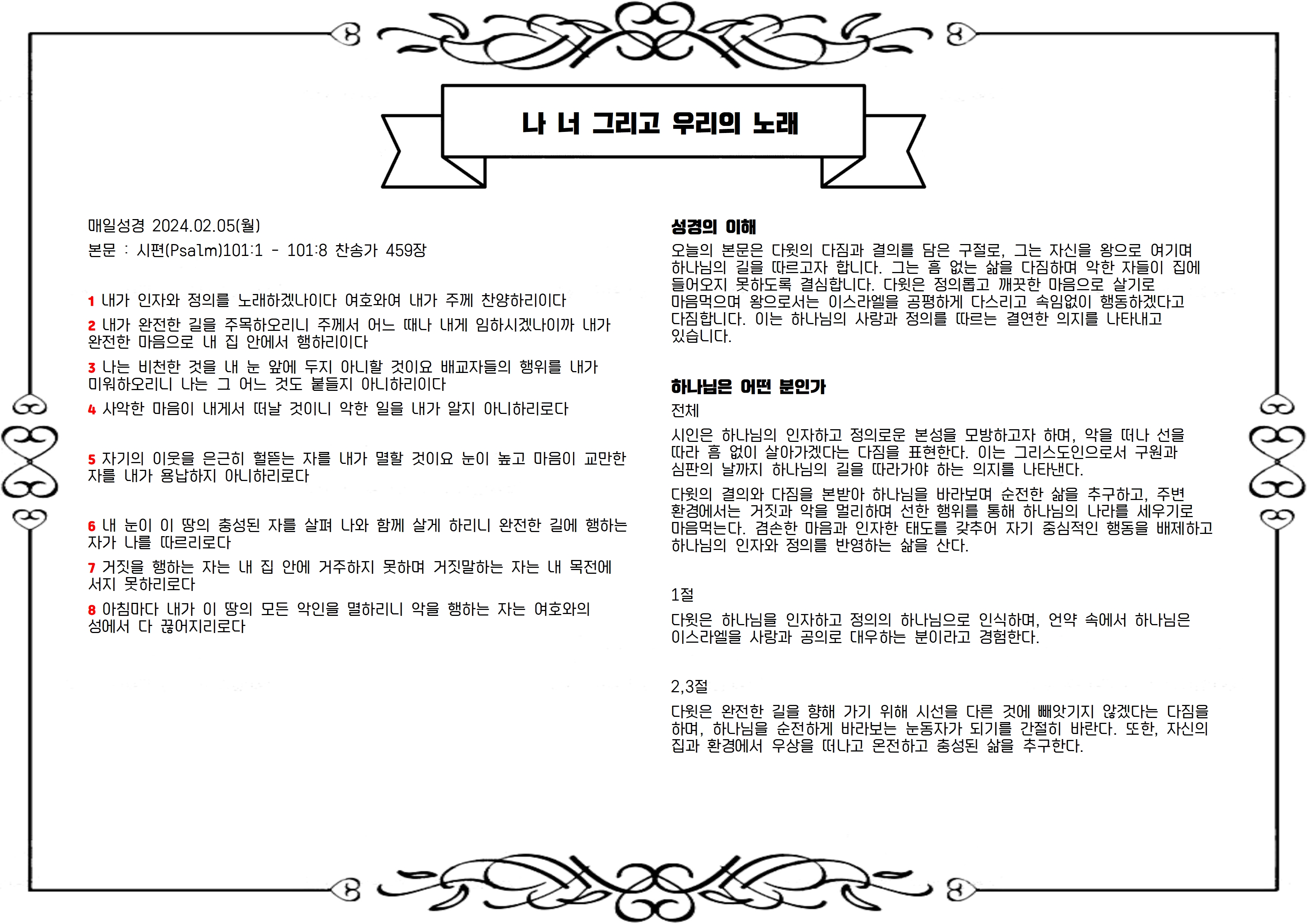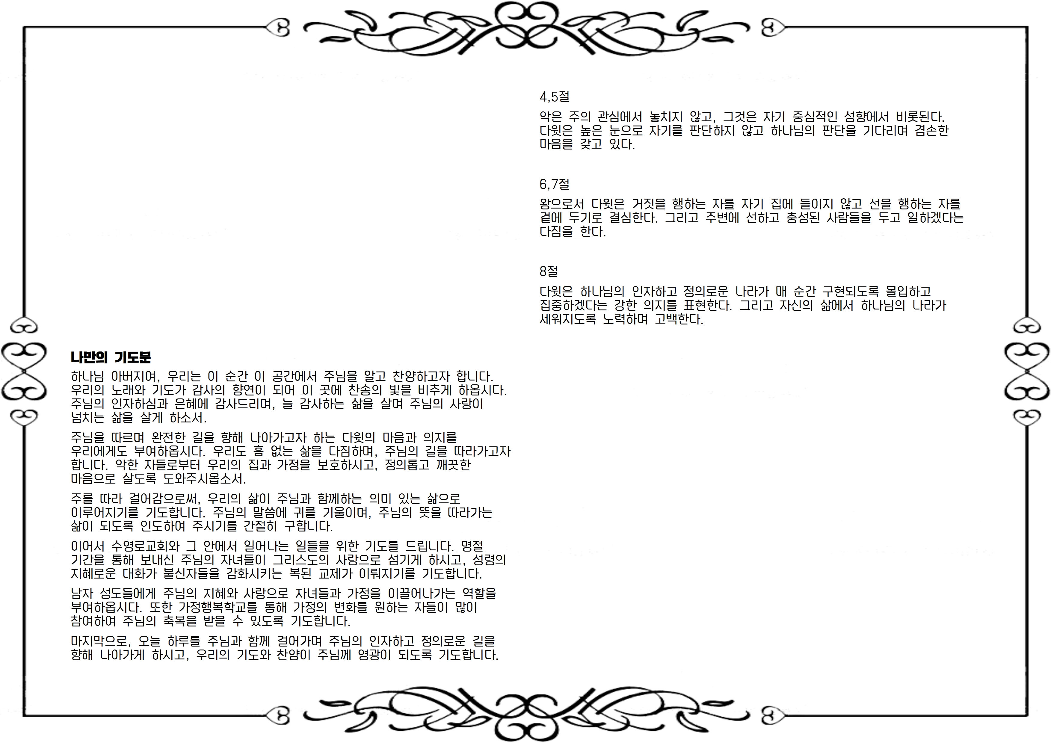 마지막으로, 오늘 하루를 주님과 함께 걸어가며 주님의 인자하고 정의로운 길을 향해 나아가게 하시고, 우리의 기도와 찬양이 주님께 영광이 되도록 기도합니다.
