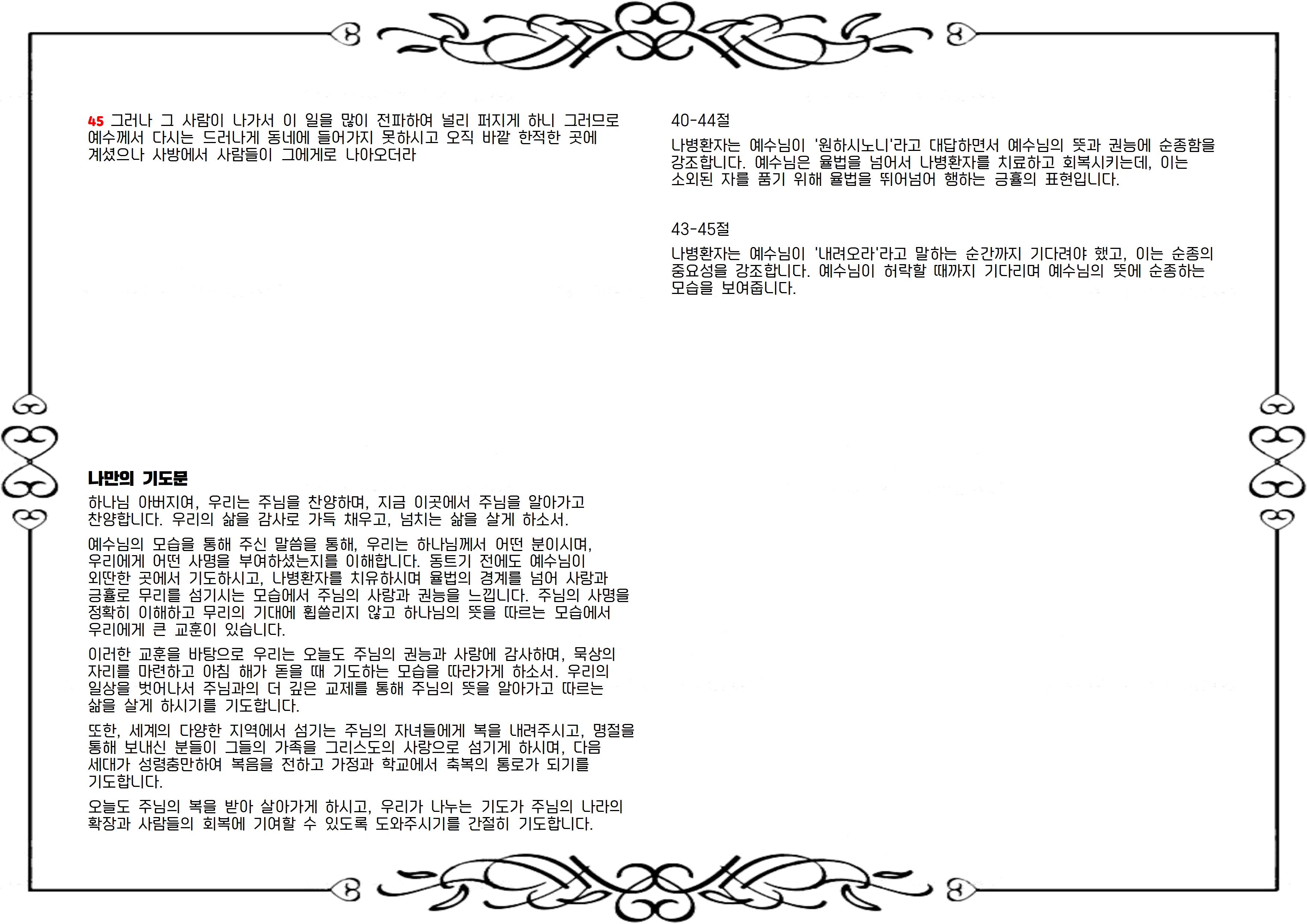예수님의 모습을 통해 주신 말씀을 통해, 우리는 하나님께서 어떤 분이시며, 우리에게 어떤 사명을 부여하셨는지를 이해합니다. 동트기 전에도 예수님이 외딴한 곳에서 기도하시고, 나병환자를 치유하시며 율법의 경계를 넘어 사랑과 긍휼로 무리를 섬기시는 모습에서 주님의 사랑과 권능을 느낍니다. 주님의 사명을 정확히 이해하고 무리의 기대에 휩쓸리지 않고 하나님의 뜻을 따르는 모습에서 우리에게 큰 교훈이 있습니다.