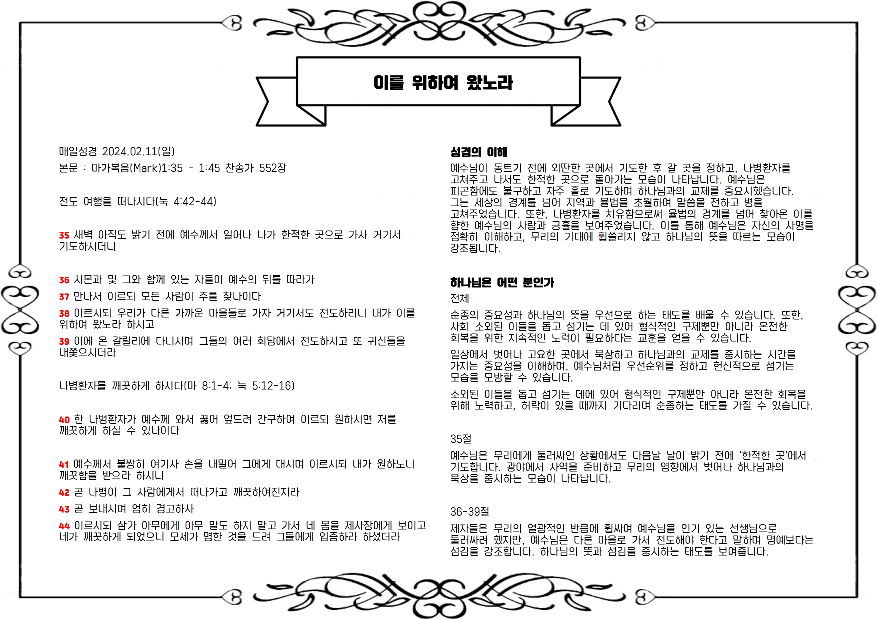 본문 : 마가복음(Mark)1:35 - 1:45 찬송가 552장