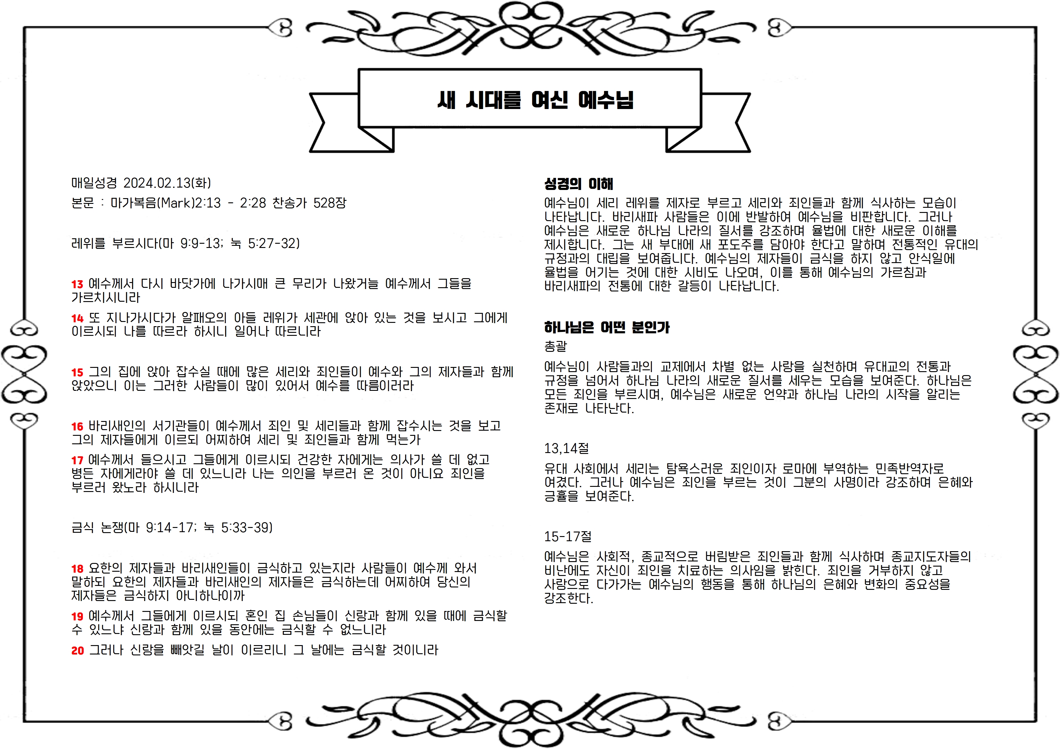 오늘의 성경 말씀을 통해 예수님이 세리 레위를 제자로 부르시고 죄인들과 함께 식사하는 모습이 나타납니다. 바리새파 사람들은 이에 반발하여 비난합니다. 그러나 주님은 새로운 하나님 나라의 질서를 강조하며 율법에 대한 새로운 이해를 제시하십니다. 우리도 주님의 가르침을 받아들여 새로운 시대의 하나님 나라를 이해하고 살아가게 하소서.