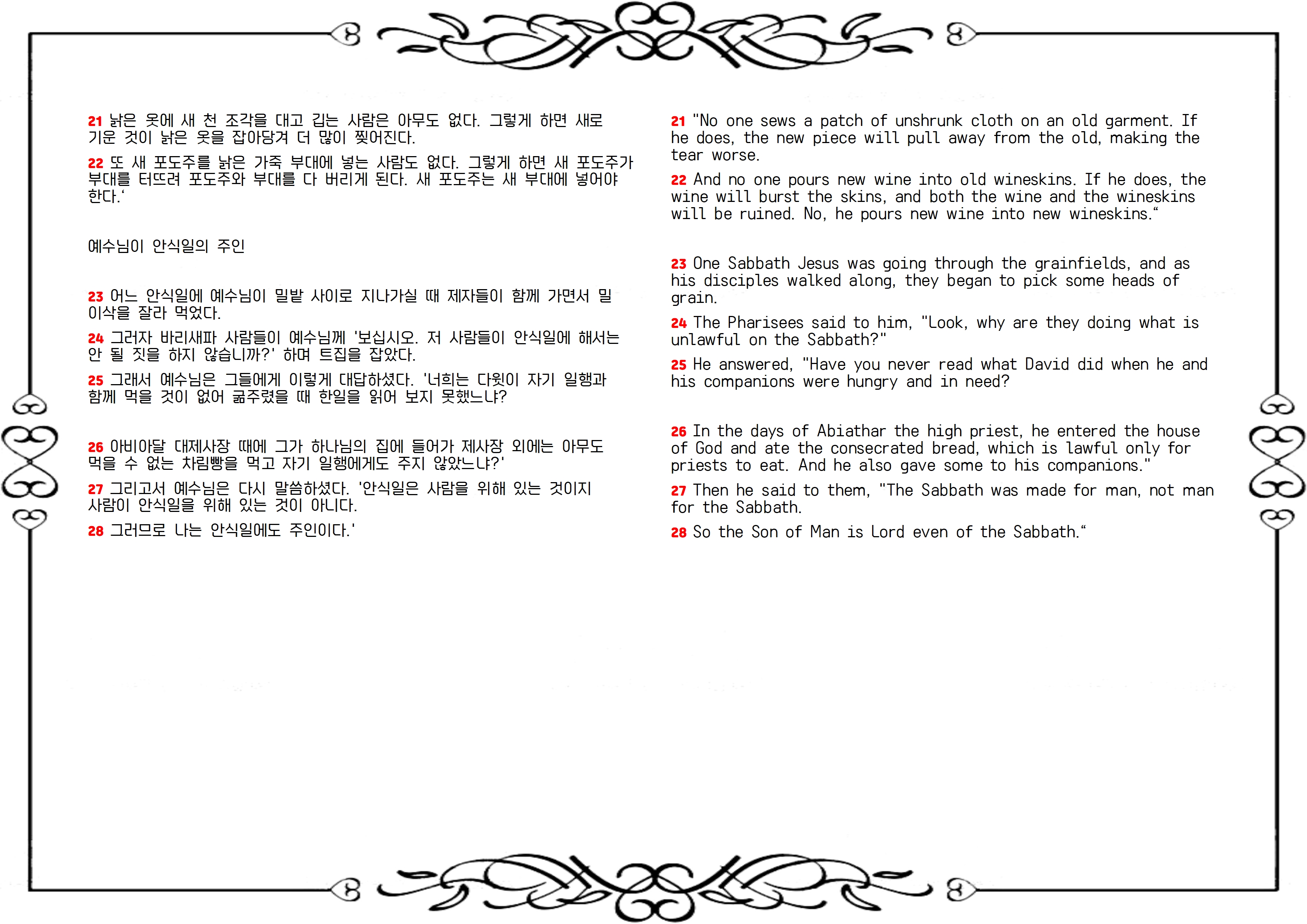 27 그리고서 예수님은 다시 말씀하셨다. '안식일은 사람을 위해 있는 것이지 사람이 안식일을 위해 있는 것이 아니다.