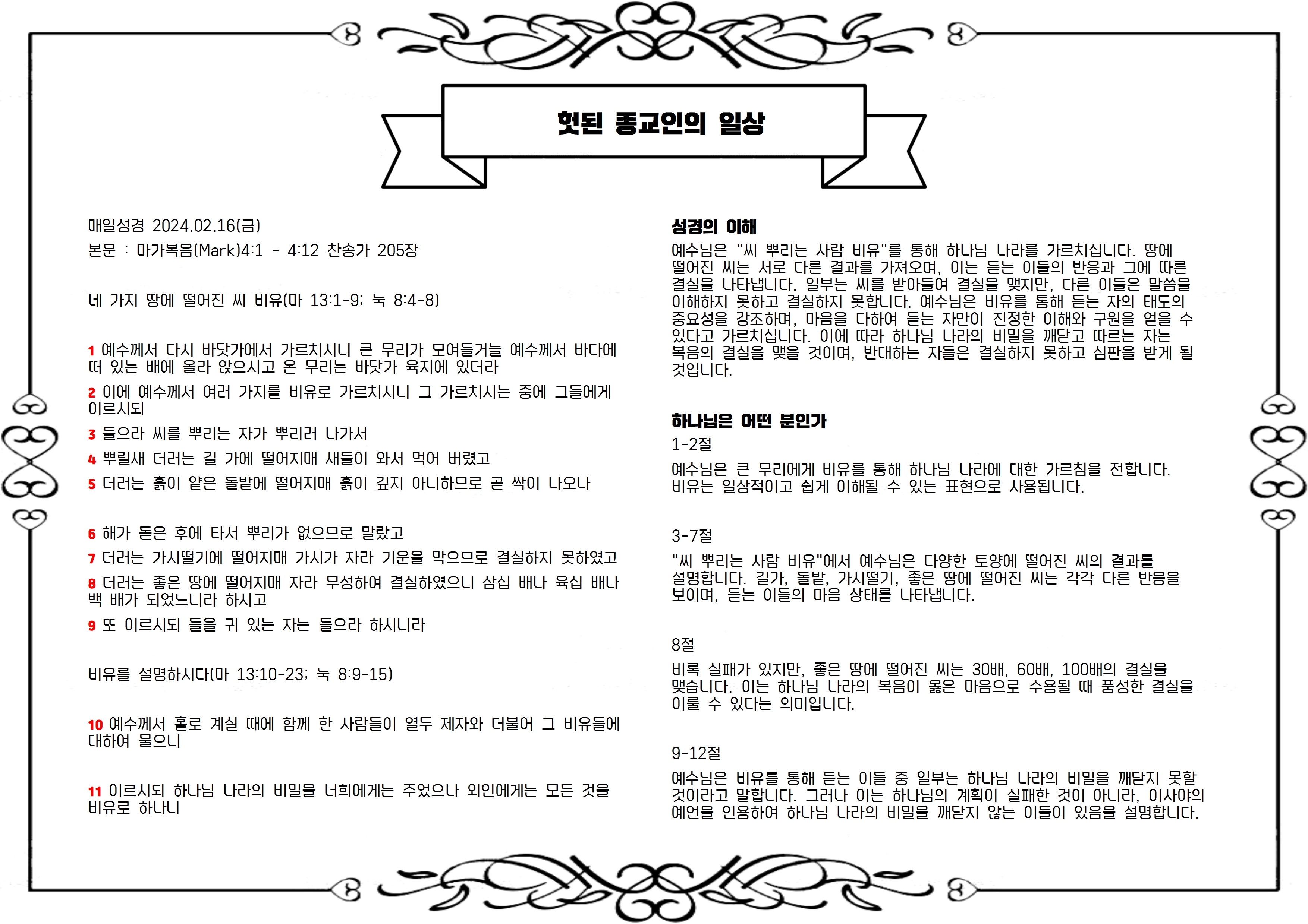 본문 : 마가복음(Mark)4:1 - 4:12 찬송가 205장