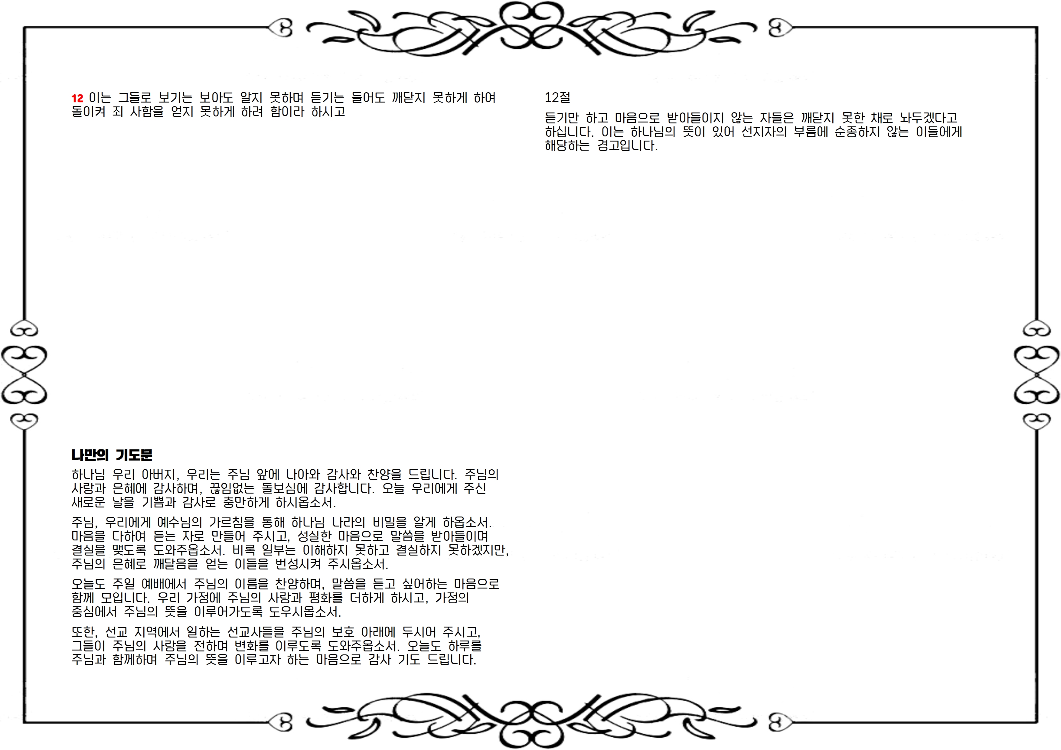 또한, 선교 지역에서 일하는 선교사들을 주님의 보호 아래에 두시어 주시고, 그들이 주님의 사랑을 전하며 변화를 이루도록 도와주옵소서. 오늘도 하루를 주님과 함께하며 주님의 뜻을 이루고자 하는 마음으로 감사 기도 드립니다.