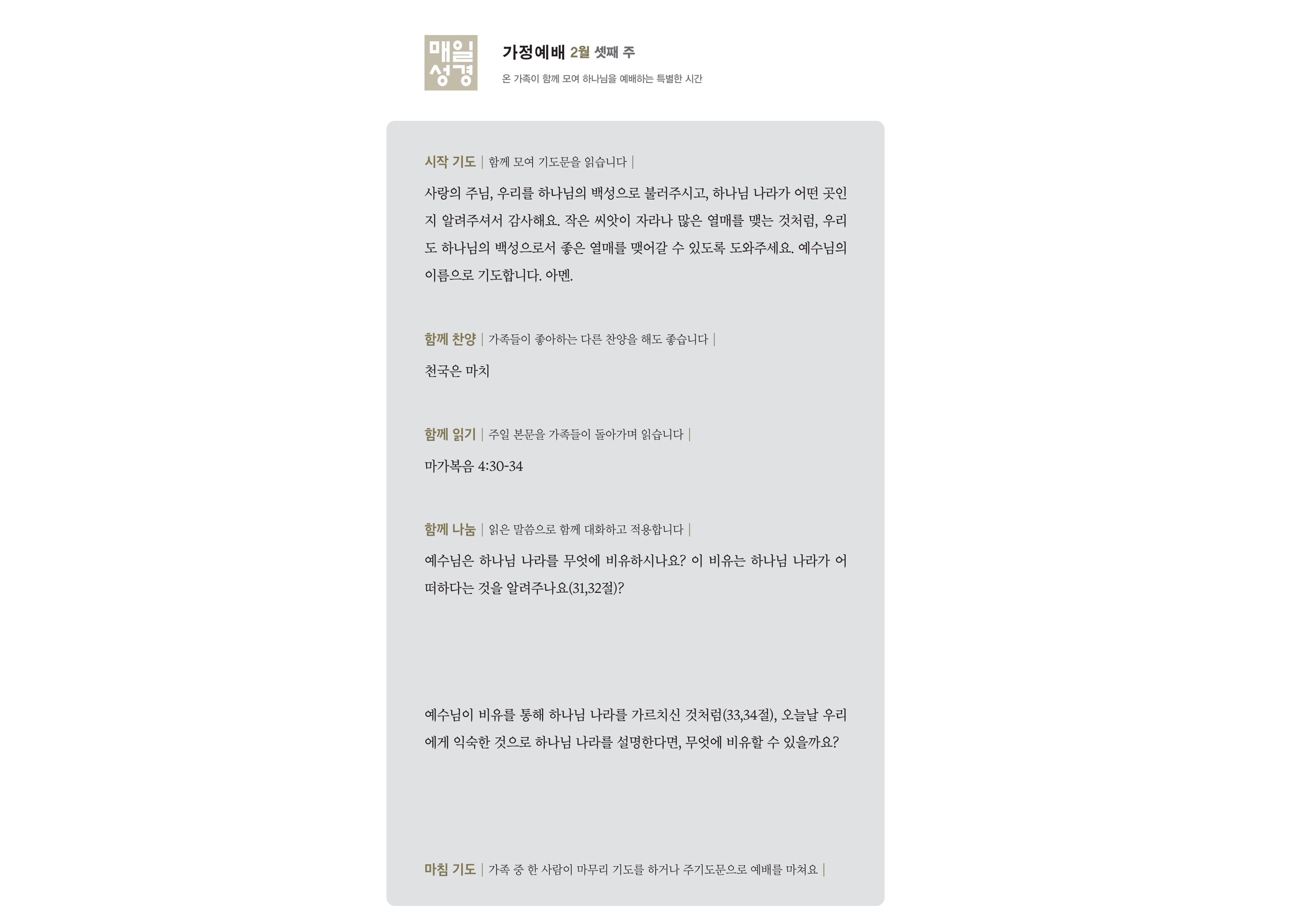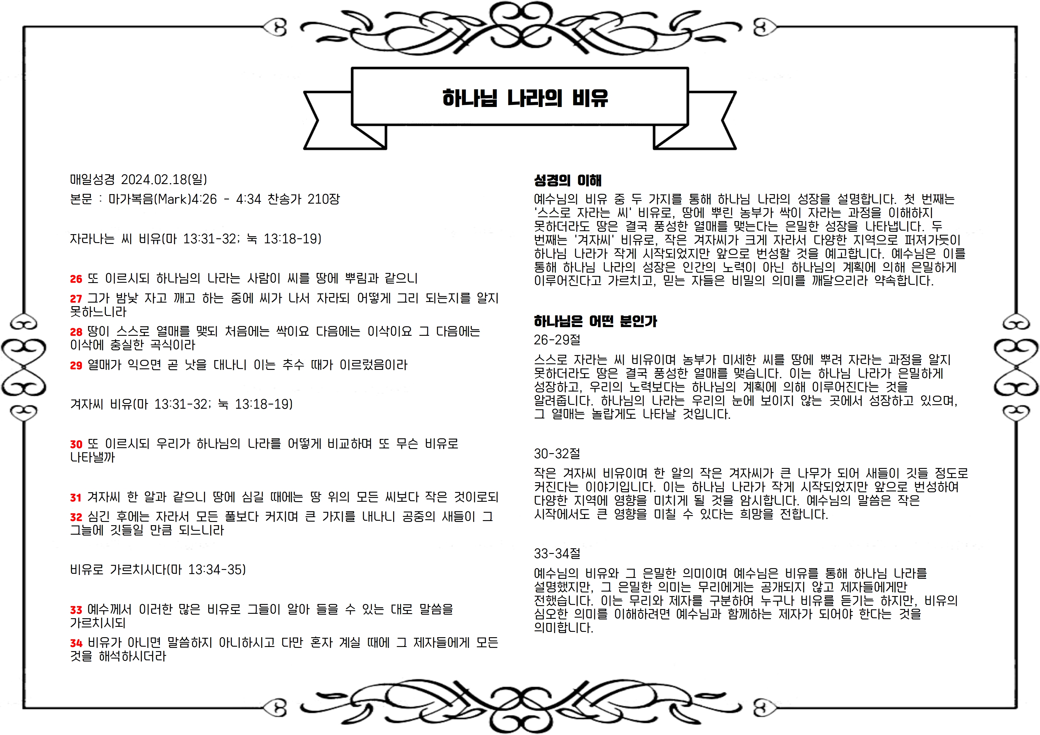 본문 : 마가복음(Mark)4:26 - 4:34 찬송가 210장
