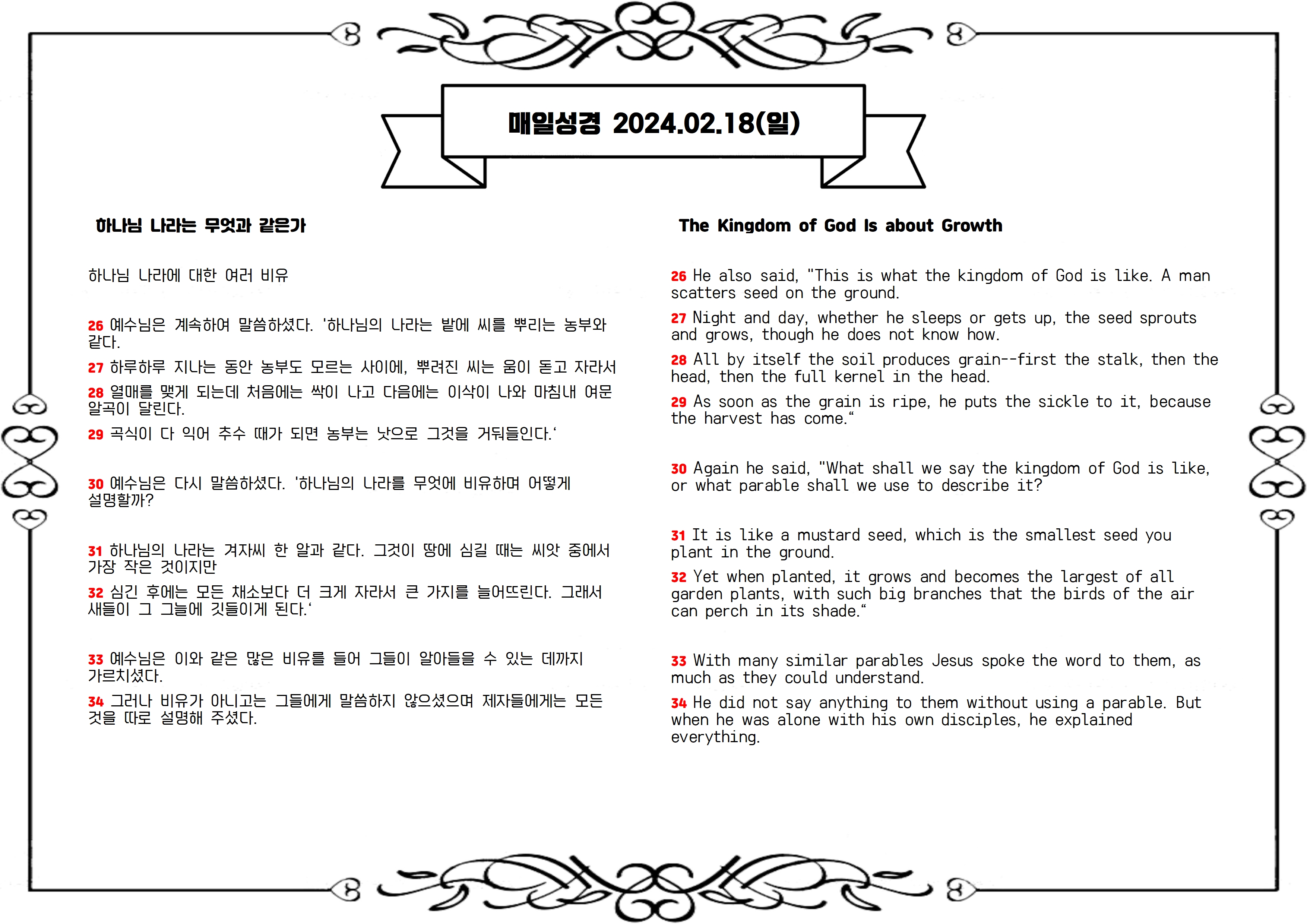 오늘 우리는 예수님의 비유를 통해 하나님 나라의 성장을 배웁니다. 작은 씨가 땅에 뿌려져 은밀하게 자라는 모습은 하나님 나라가 우리 눈에 보이지 않는 곳에서 성장하고 있다는 것을 알려줍니다. 농부가 모르는 사이에 땅은 결실하고 열매를 맺듯이 하나님 나라도 은밀하게 성장하여 우리에게 풍성한 열매를 맺게 하소서.